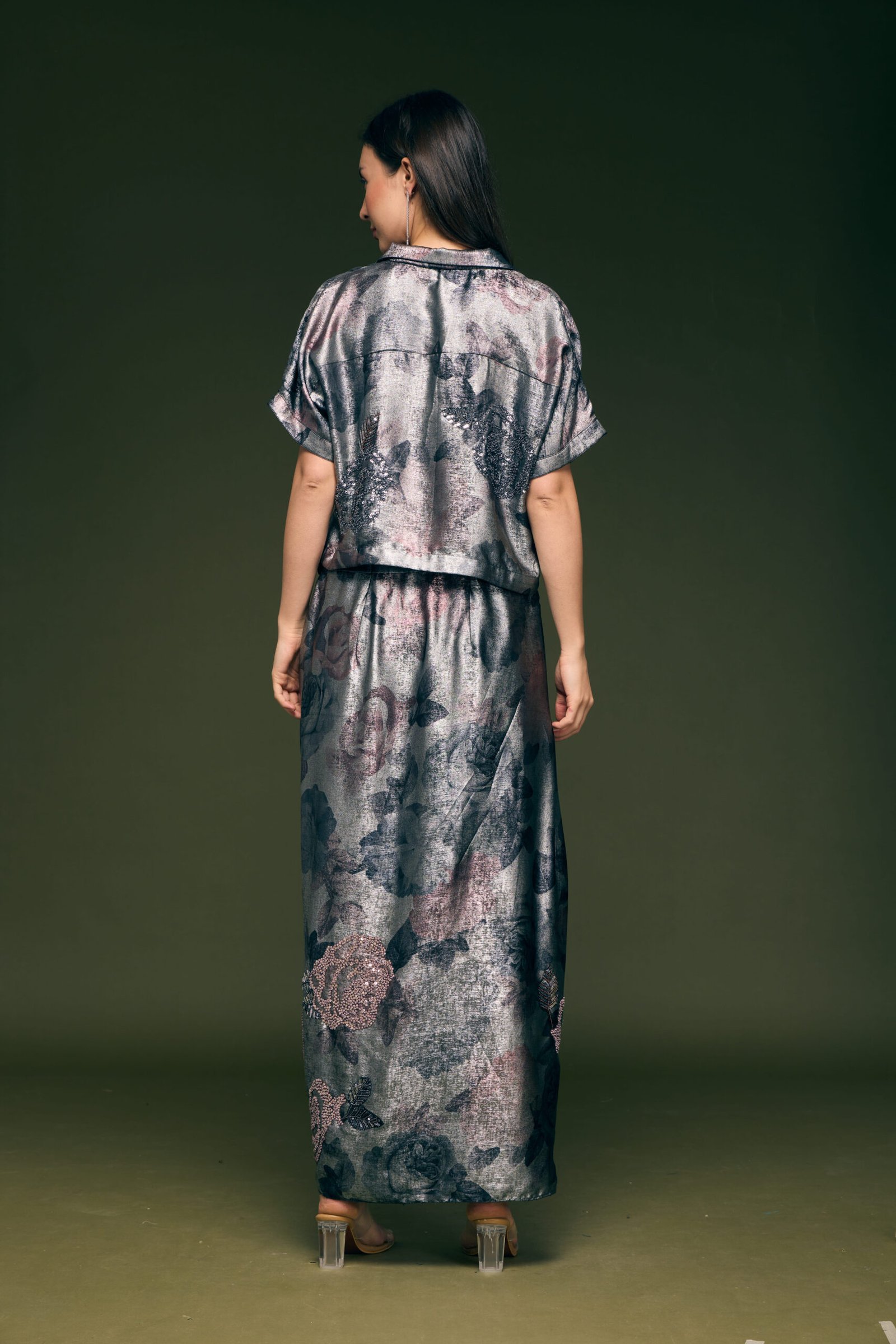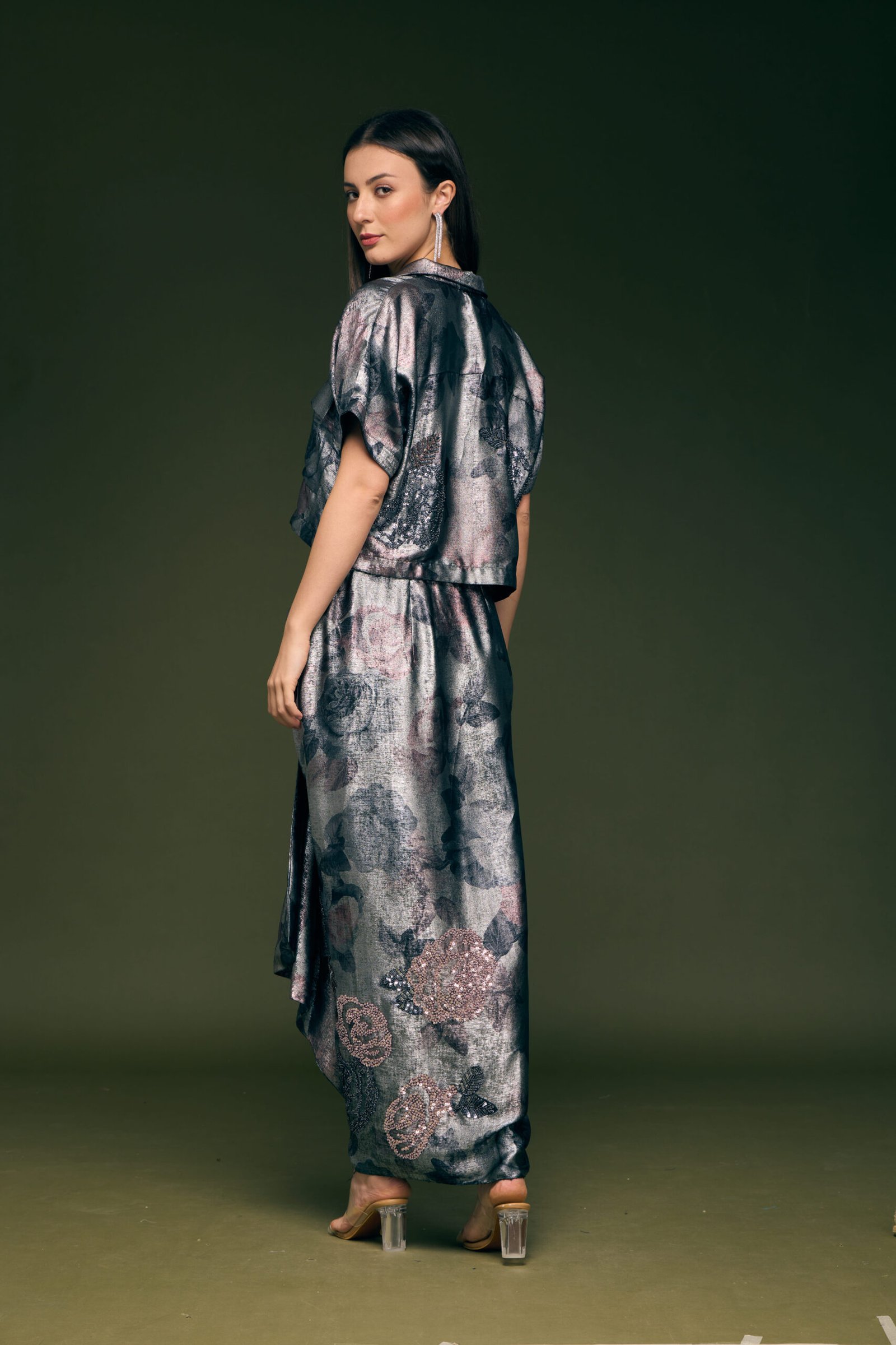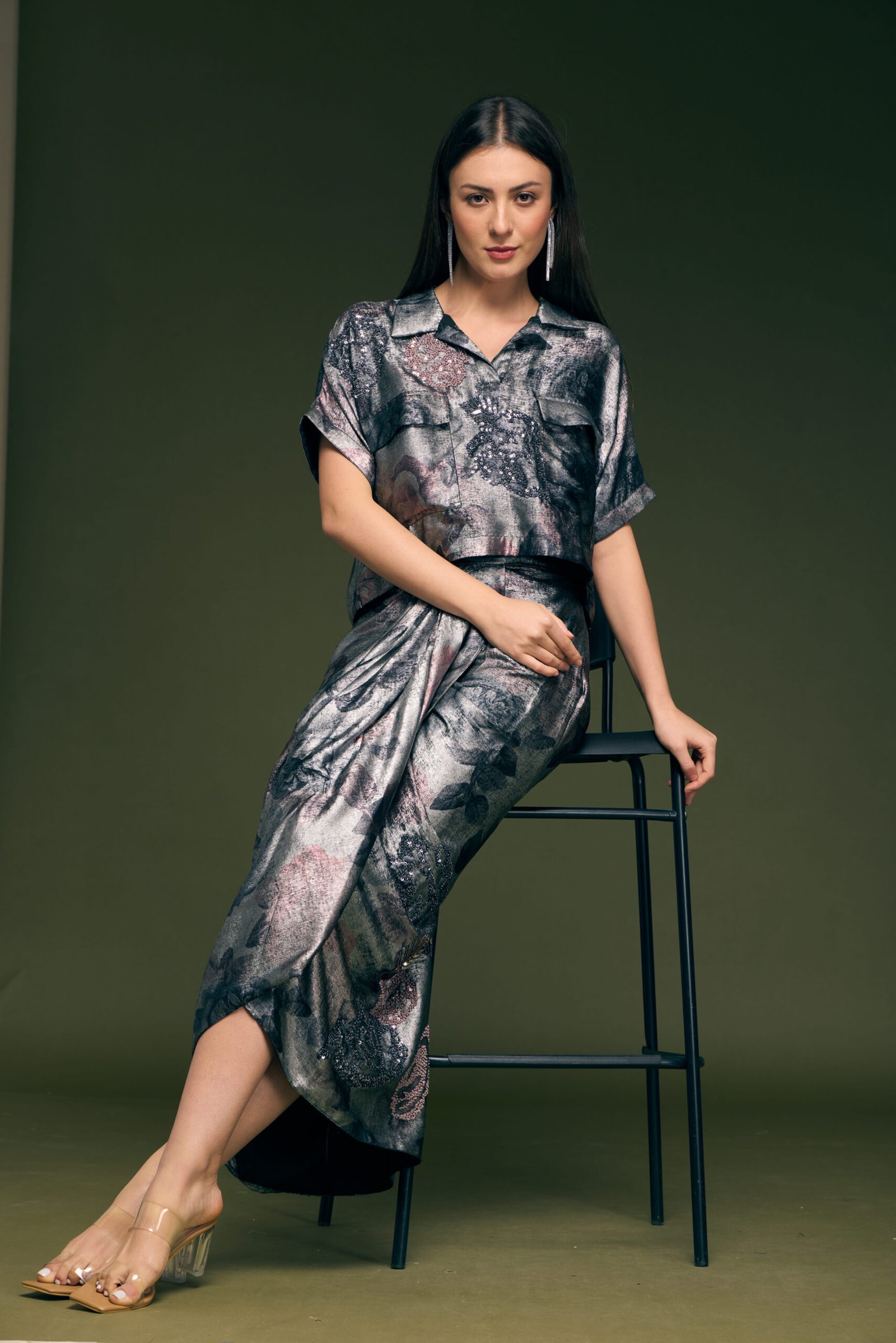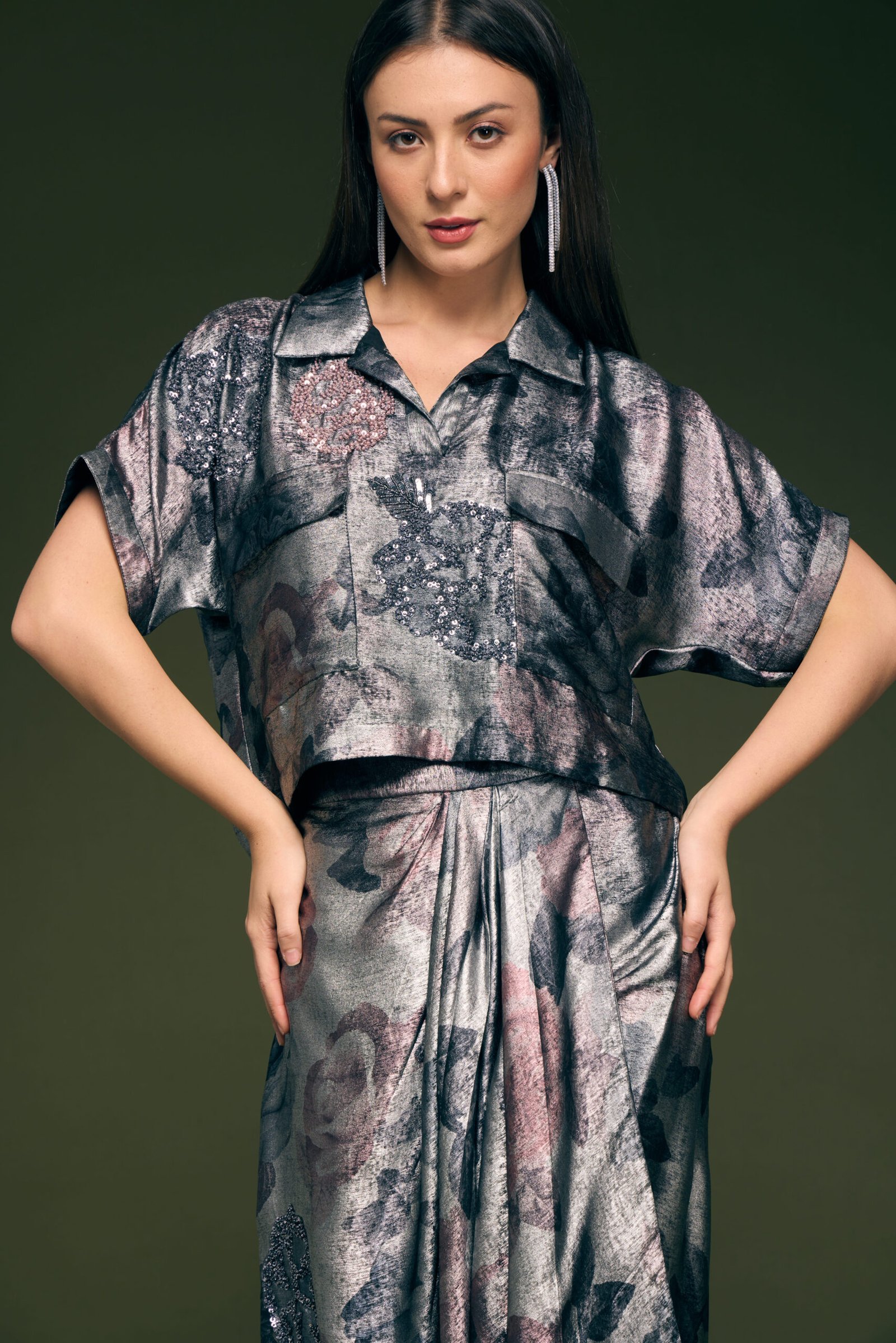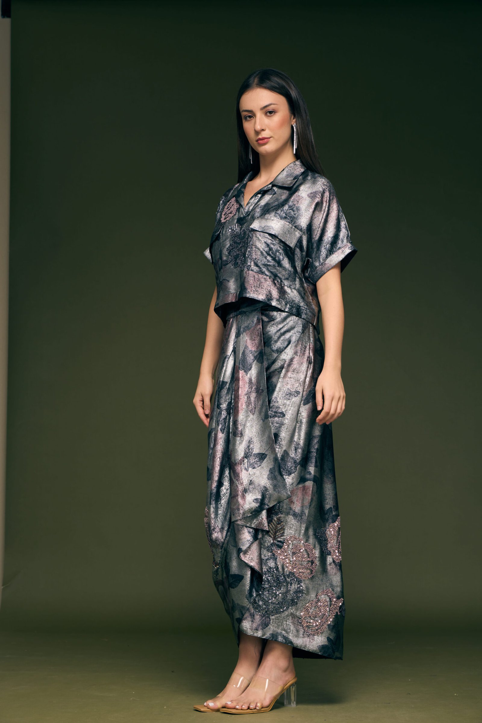 Black Matelic With Sequence With Beads Embellished Crop Top With Drape Skirt