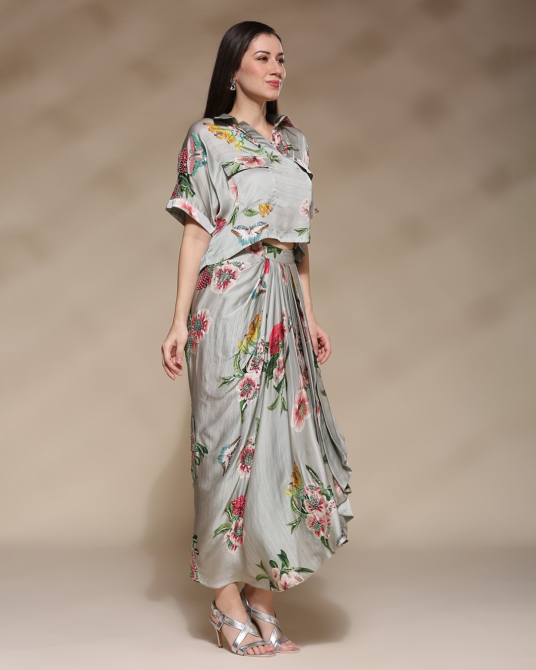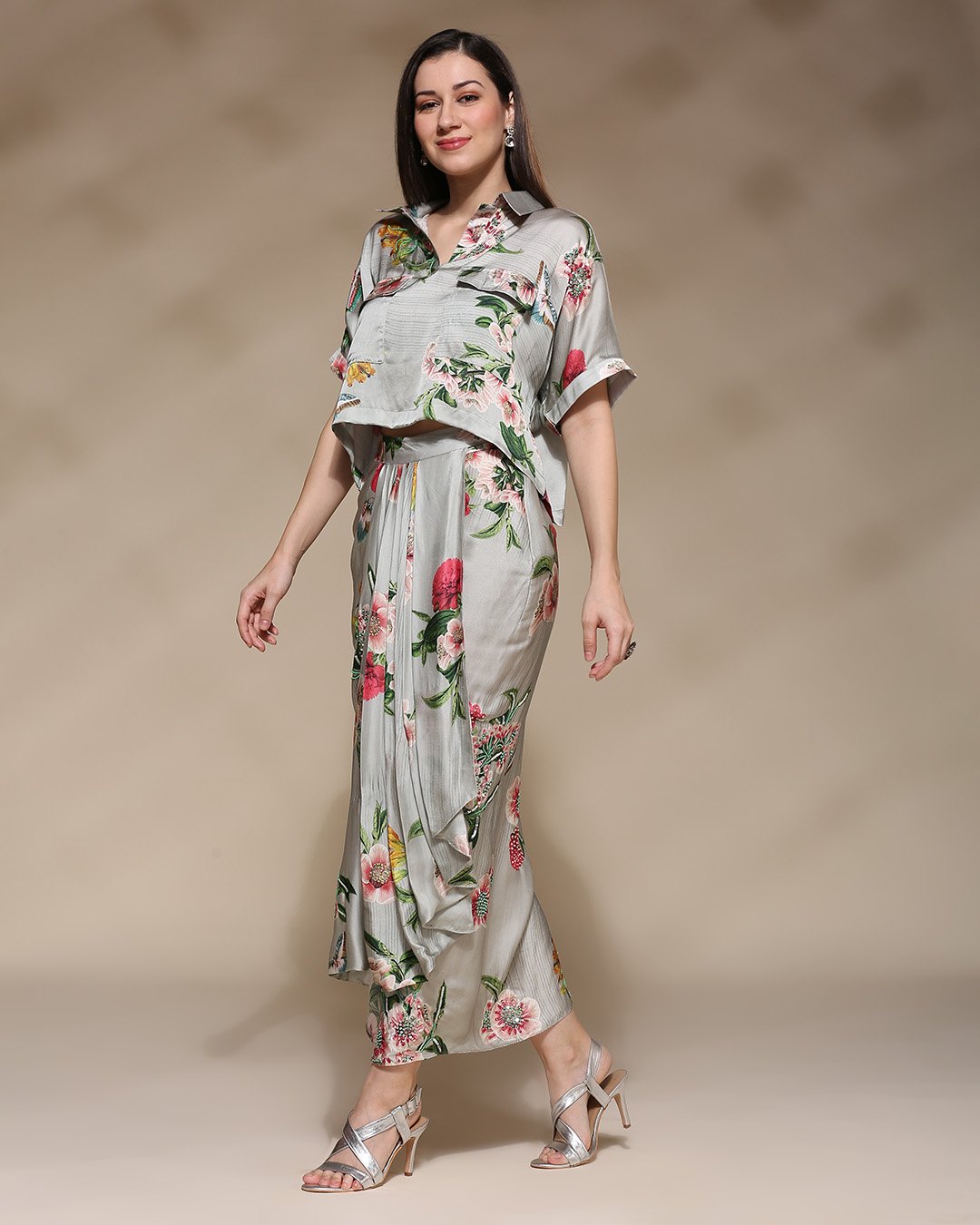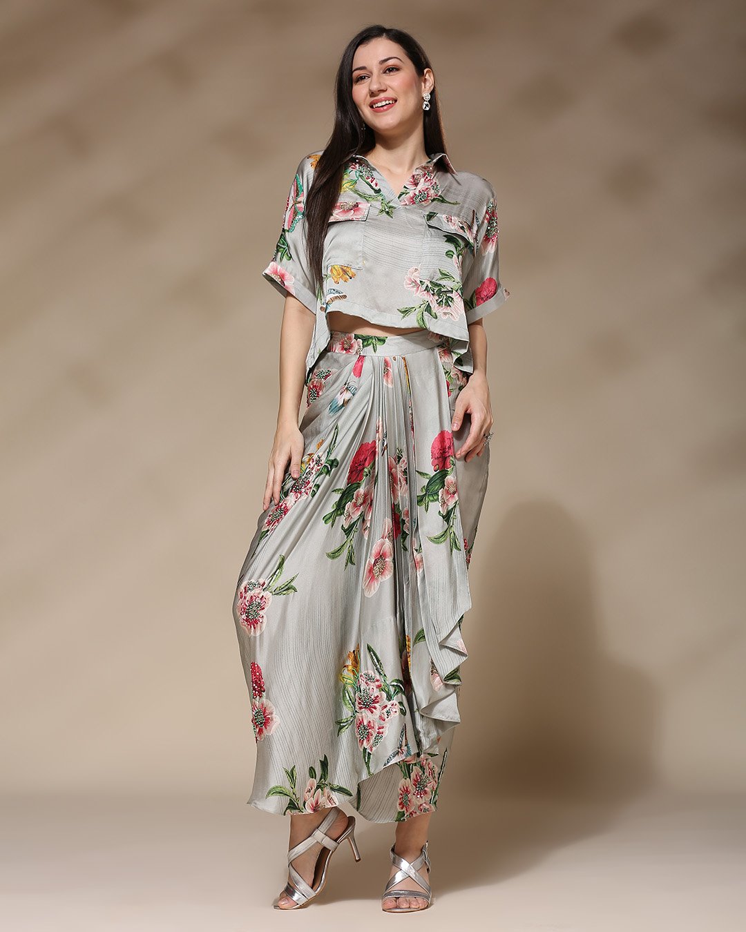 Fabric- Pure Modal Satin Silk Elevate your festive charm with this effortlessly chic Blush Bloom Draped Co-ord Set. Crafted in a luxurious satin-silk blend, this ensemble features a collared, button-down crop shirt paired with a statement draped dhoti-style skirt. The pastel grey base is beautifully adorned with vibrant floral prints in shades of pink, green, and yellow, adding a splash of freshness and femininity. The relaxed-fit shirt with short sleeves and boxy silhouette gives a laid-back yet sophisticated vibe, while the structured pleats and cascading layers of the skirt lend movement and flair to your look. Perfect for daytime events, destination weddings, or fusion functions, this outfit strikes the perfect balance between comfort and couture.
