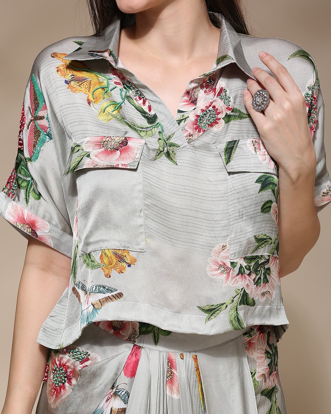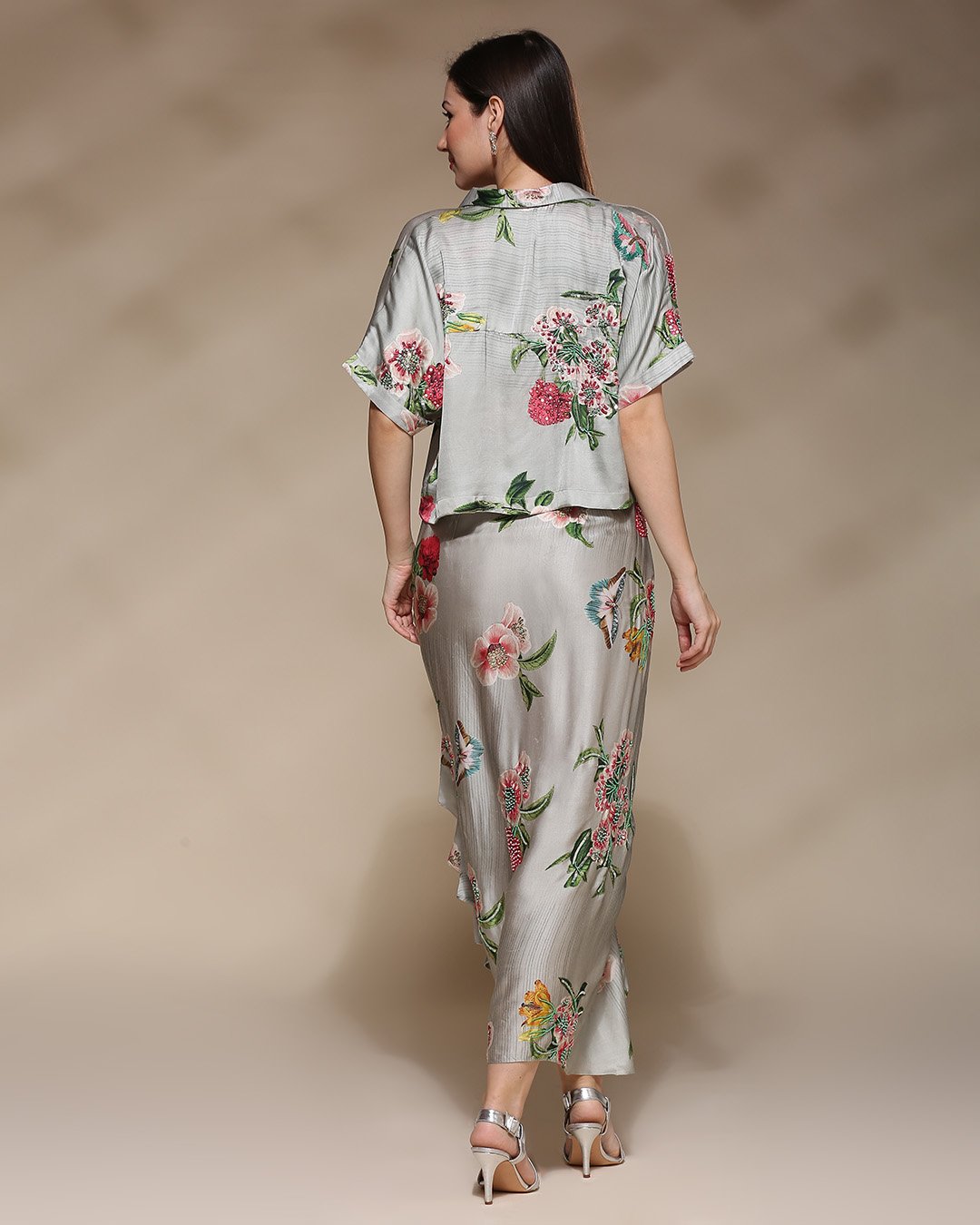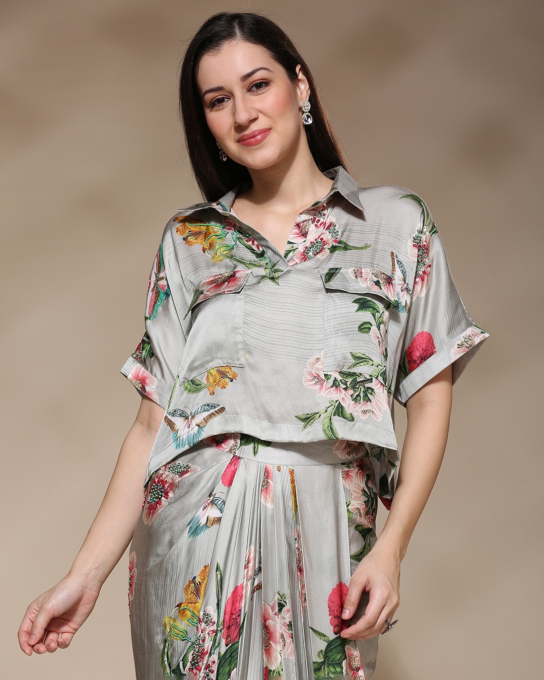 Fabric- Pure Modal Satin Silk Elevate your festive charm with this effortlessly chic Blush Bloom Draped Co-ord Set. Crafted in a luxurious satin-silk blend, this ensemble features a collared, button-down crop shirt paired with a statement draped dhoti-style skirt. The pastel grey base is beautifully adorned with vibrant floral prints in shades of pink, green, and yellow, adding a splash of freshness and femininity. The relaxed-fit shirt with short sleeves and boxy silhouette gives a laid-back yet sophisticated vibe, while the structured pleats and cascading layers of the skirt lend movement and flair to your look. Perfect for daytime events, destination weddings, or fusion functions, this outfit strikes the perfect balance between comfort and couture.