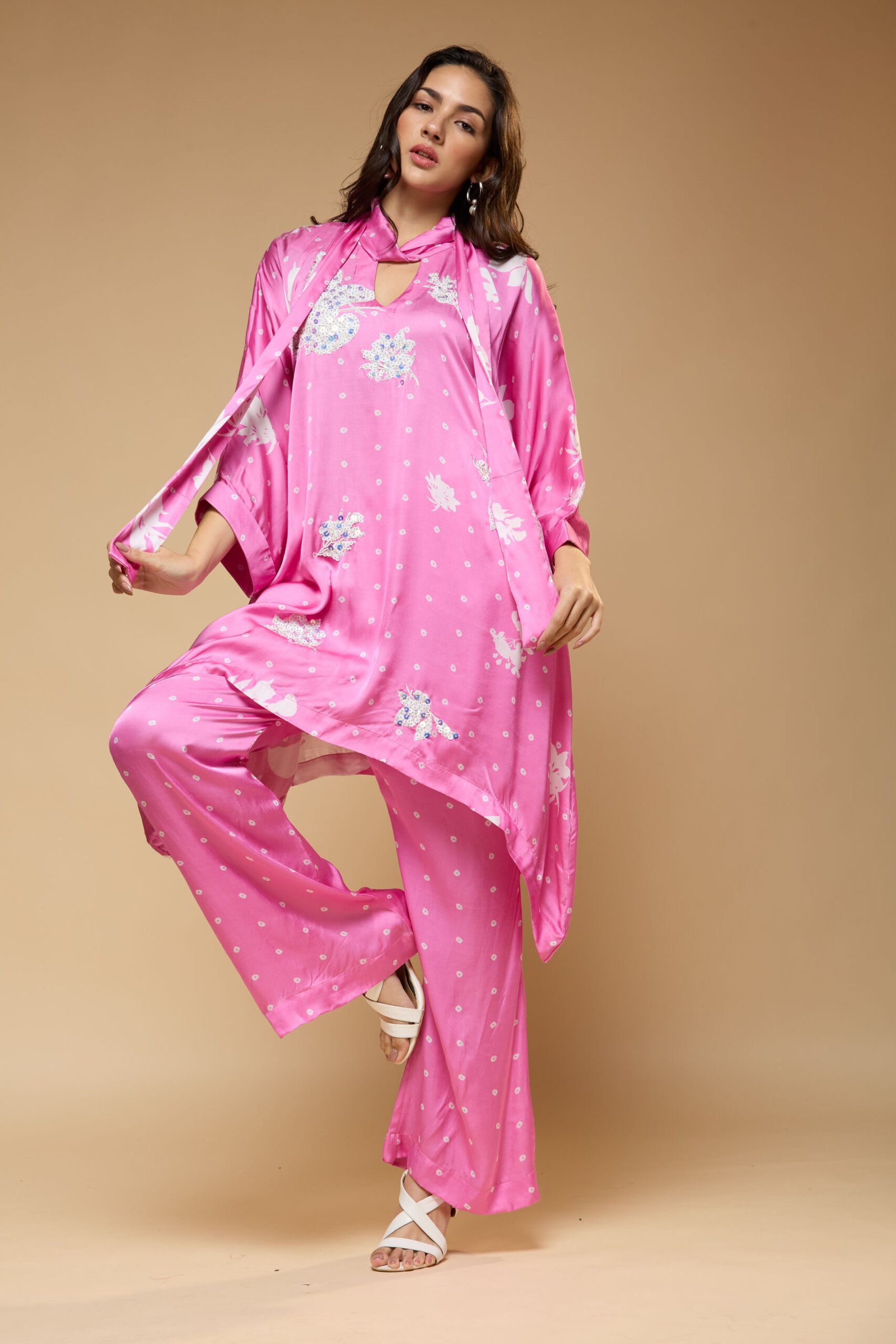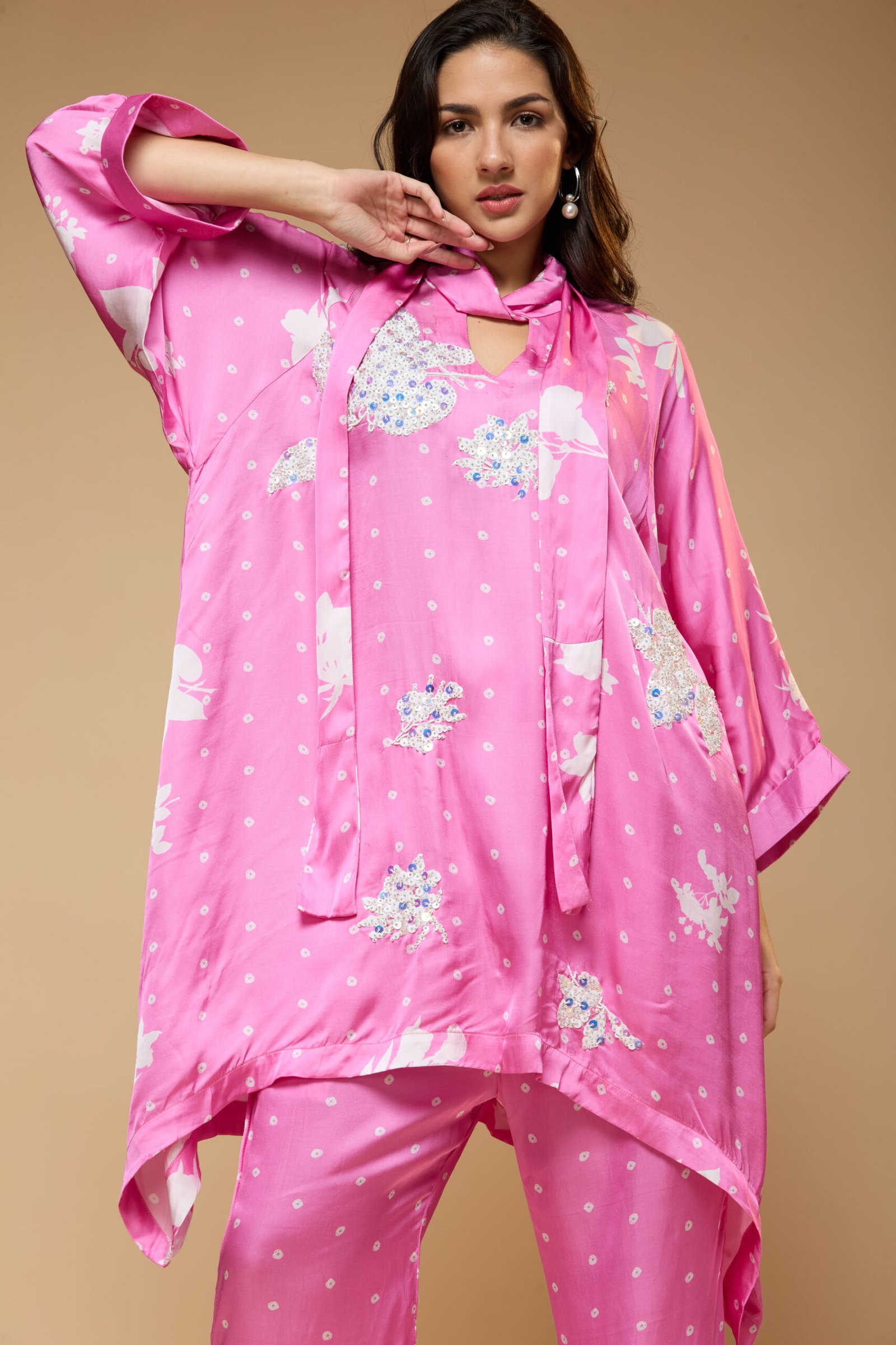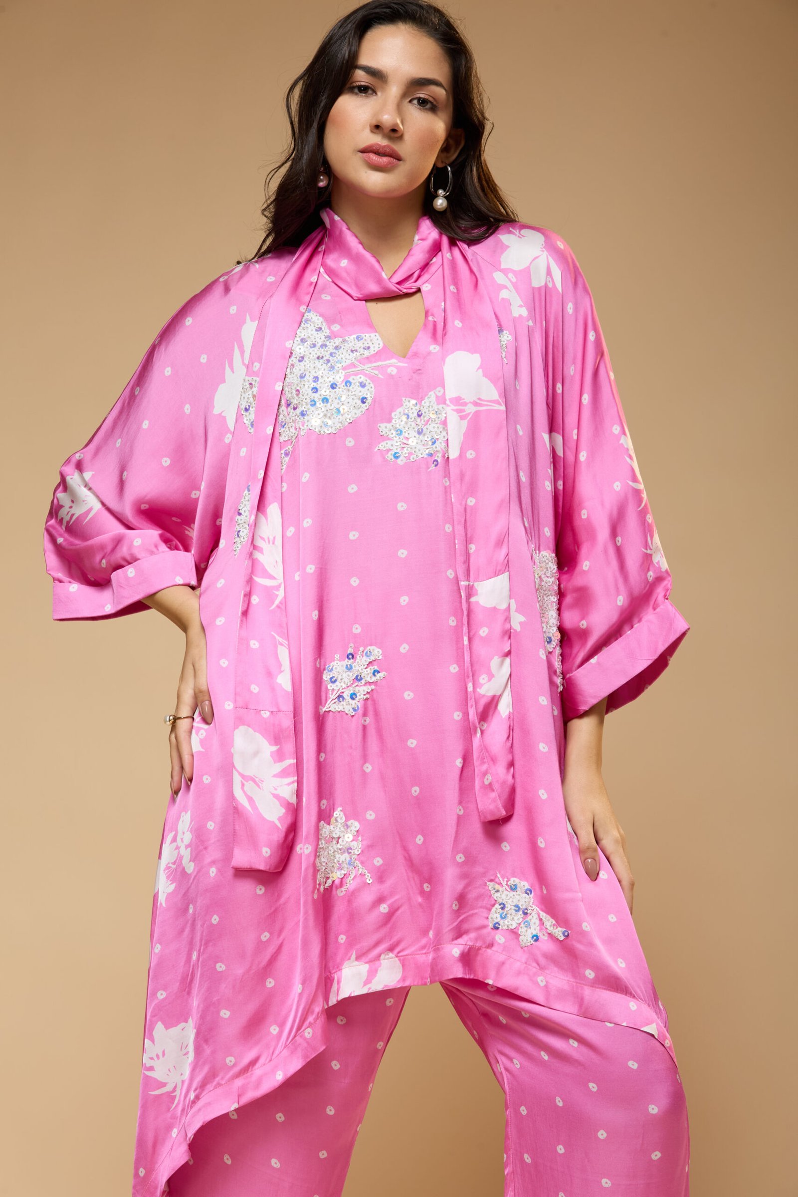 PS Pink Bandhani With Lotus Print Modal Satin Silk Bow Style With White Sequence Embroidery Coord Set