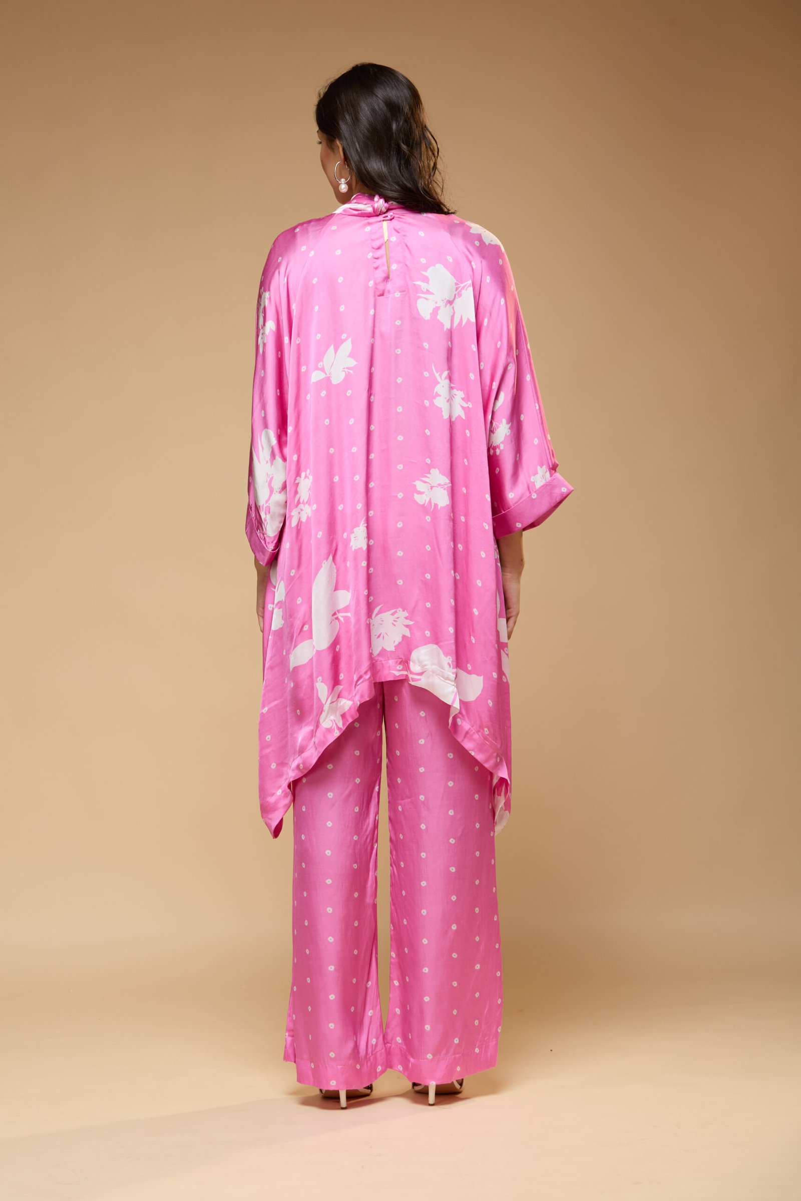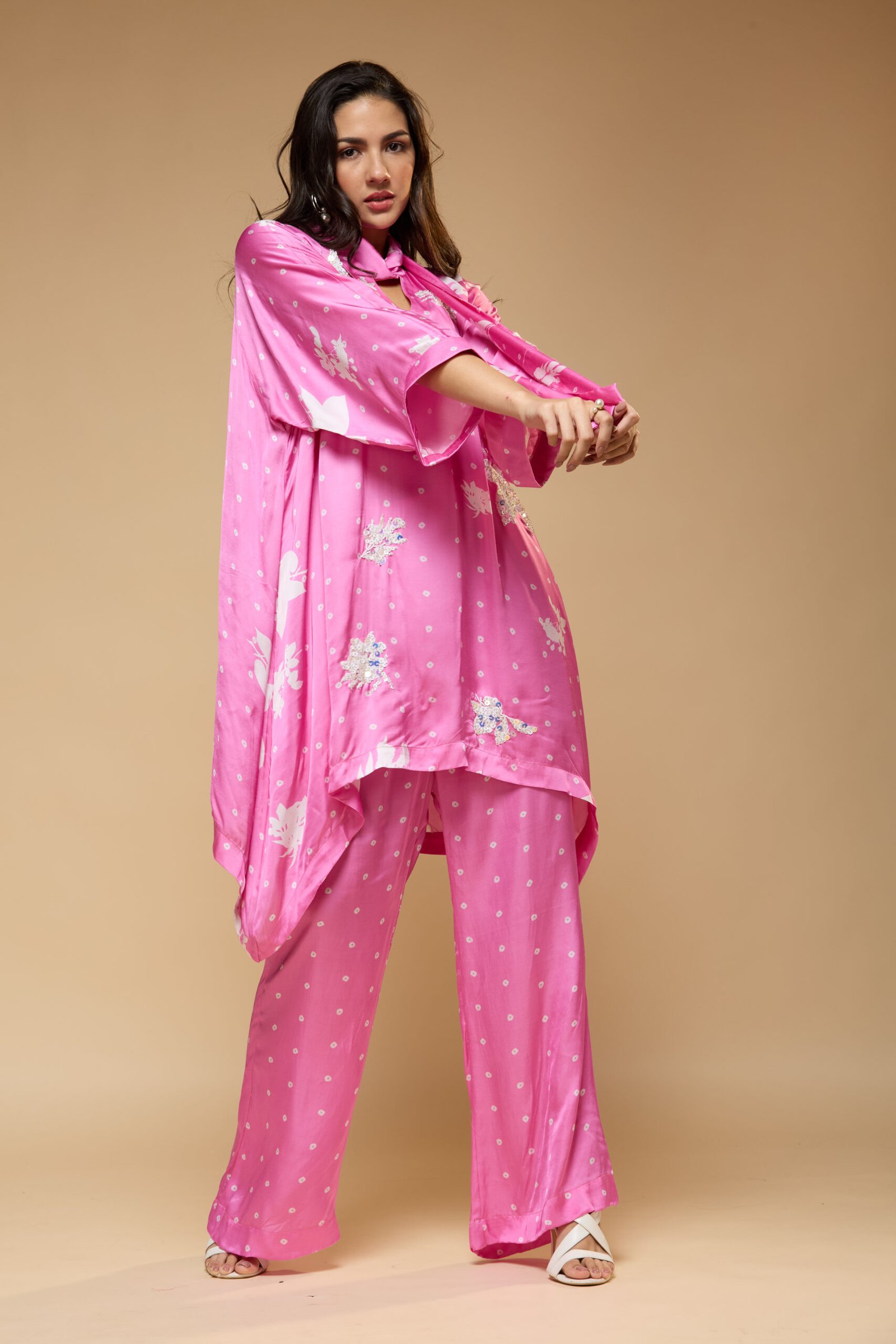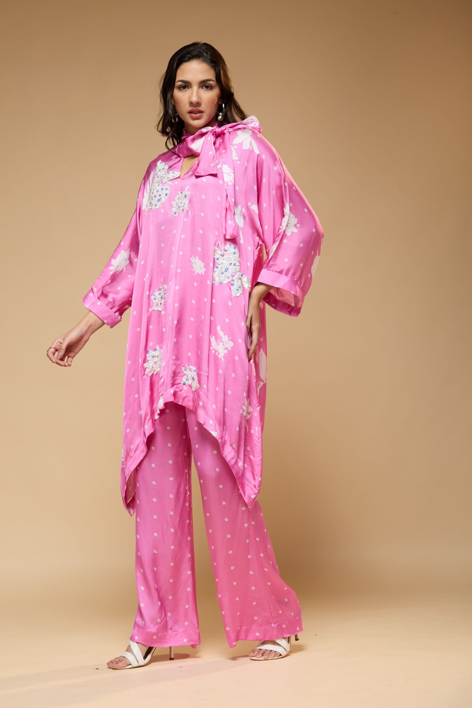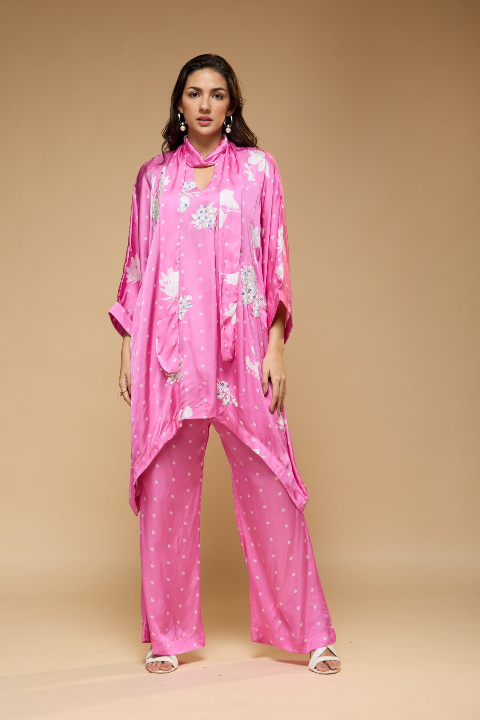 PS Pink Bandhani With Lotus Print Modal Satin Silk Bow Style With White Sequence Embroidery Coord Set
