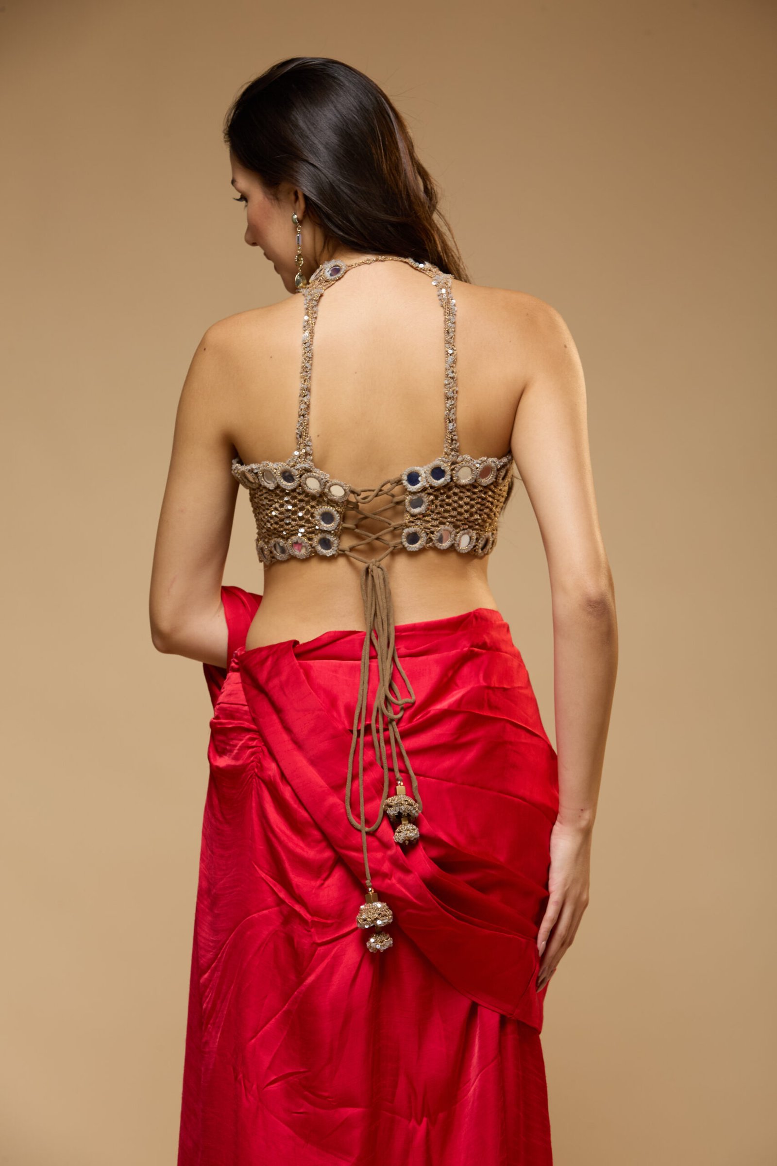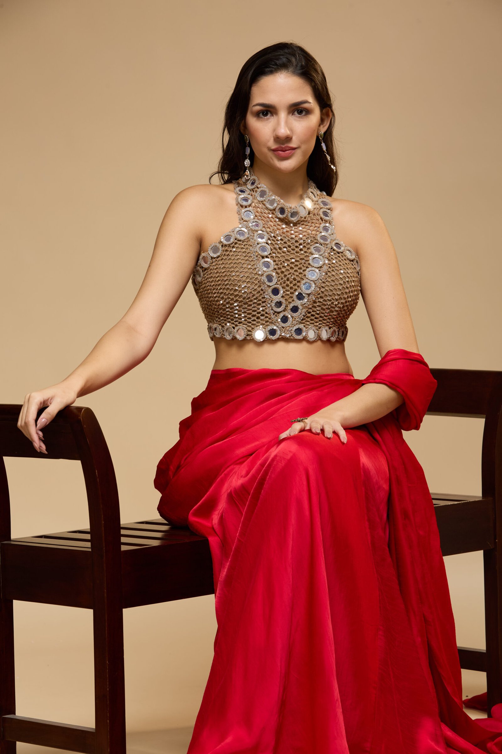 A true show-stopper, this bronze blouse is hand-embellished with intricate mirror work, creating a mesmerizing shimmer with every move. Designed in a high-neck halter silhouette with a fitted bodice, it blends modern glam with traditional flair. Pair it with a red or neutral saree for sangeet nights, weddings, or any celebration that demands attention.