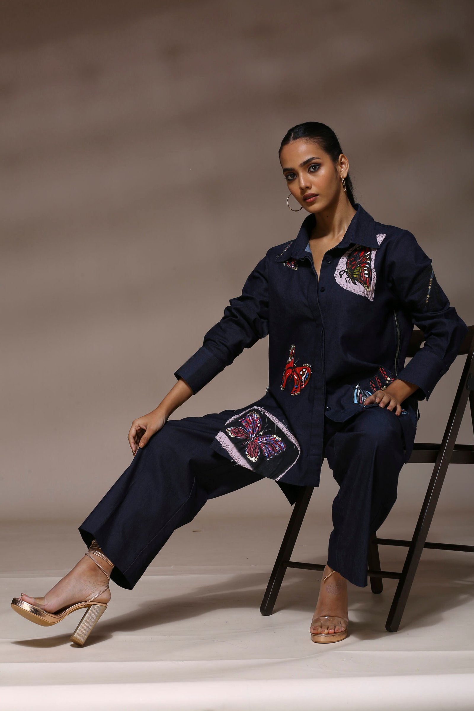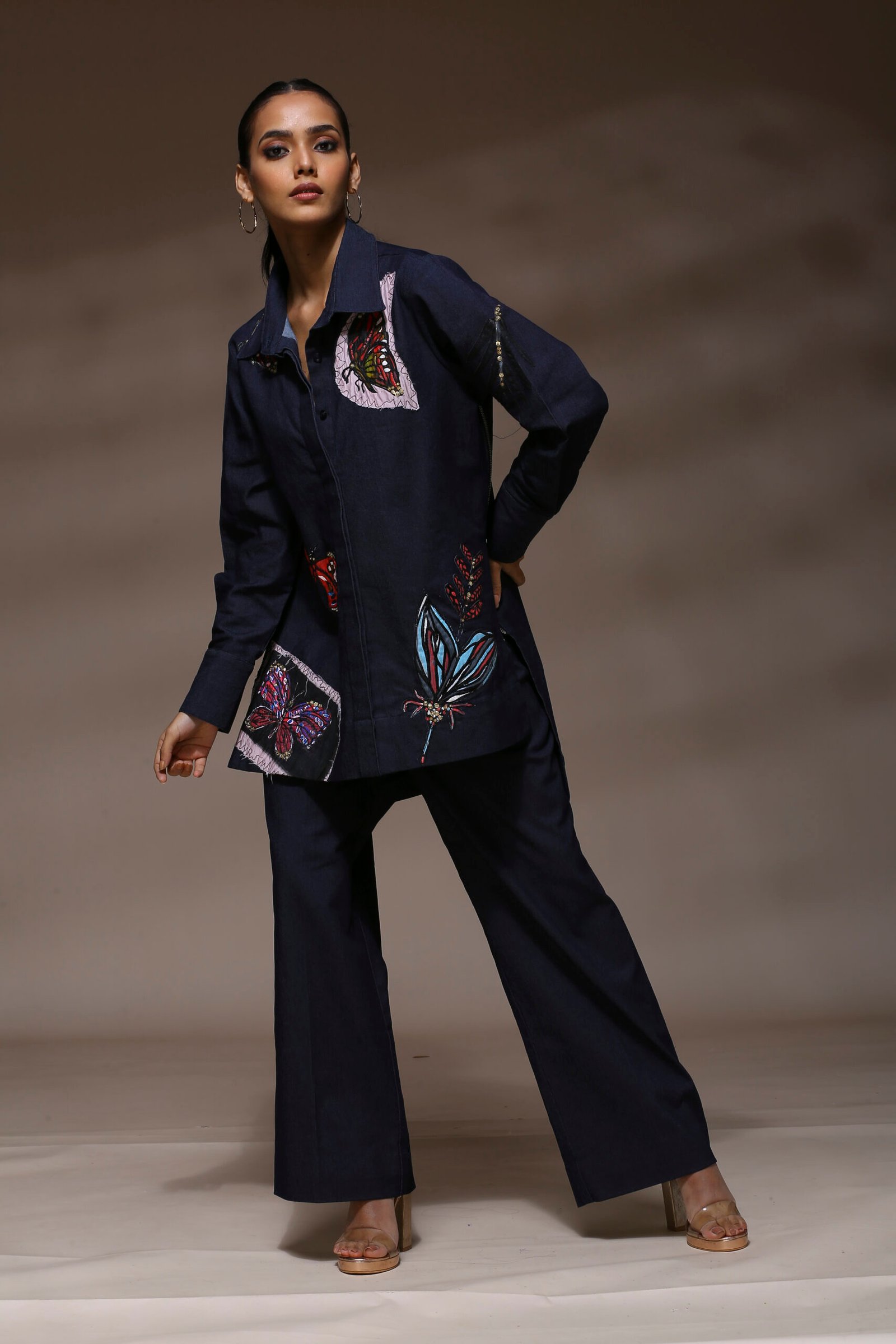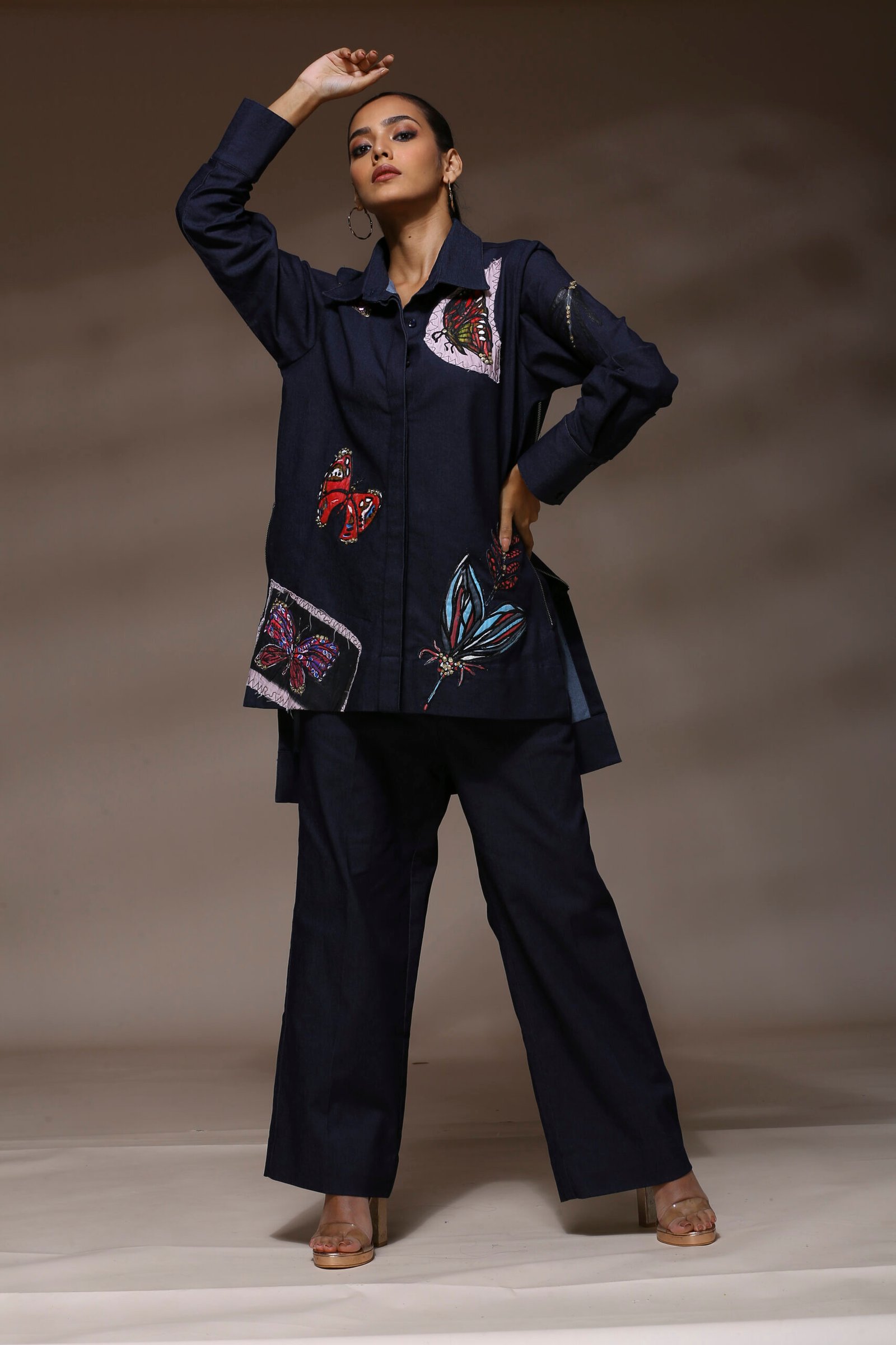 Fabric- Dark Blue Denim Embrace your transformation in style with the Butterfly Blues Co-ord Set — a dramatic yet graceful ensemble that celebrates individuality and evolution. Rendered in a rich navy hue, this full-sleeved shirt and trouser duo is crafted from premium cotton with a crisp, structured finish. The standout element is the vibrant butterfly appliqué bu Bina Aziz with patchwork embroidery adorning the shirt — a beautiful representation of freedom, growth, and change. Pops of fuchsia, teal, red, and lilac bring a dreamy contrast to the deep base, creating a visual story that’s both artistic and empowering. Intricate bead detailing along the sleeve adds a touch of sparkle and movement. Tailored straight trousers anchor the look with clean lines, making this set ideal for statement evenings, creative events, or anywhere you want to make an impression with confidence and poise.