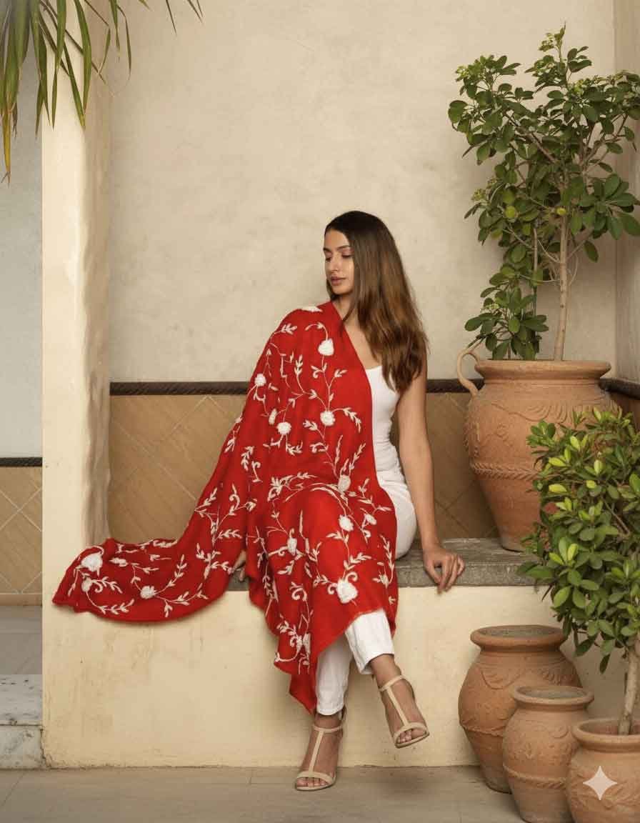 Red – White Thread Zardozi With Cutdana Full Jaal Work Embroidery Shawl