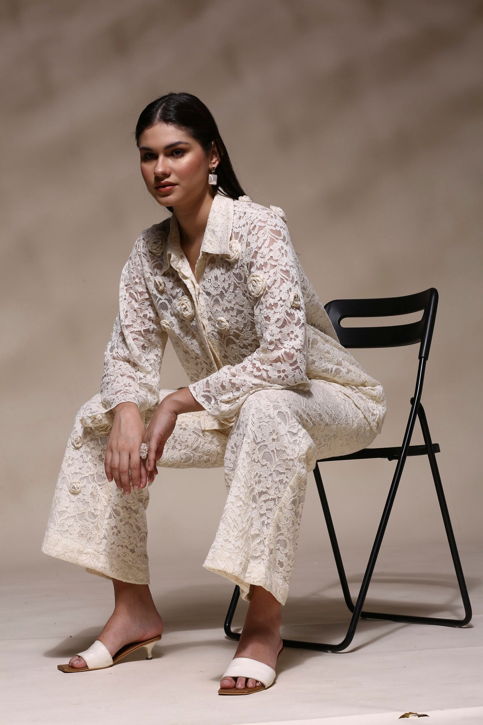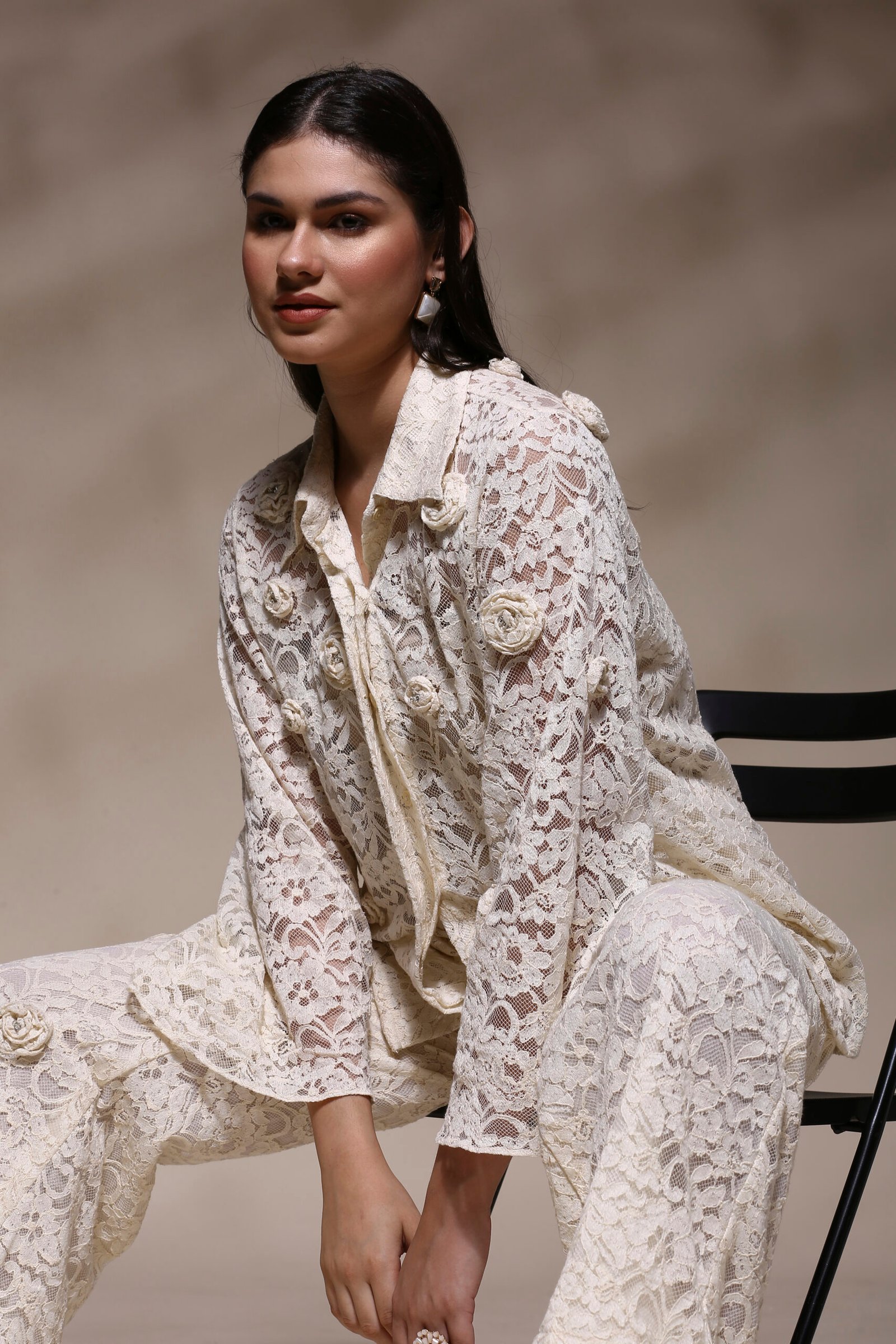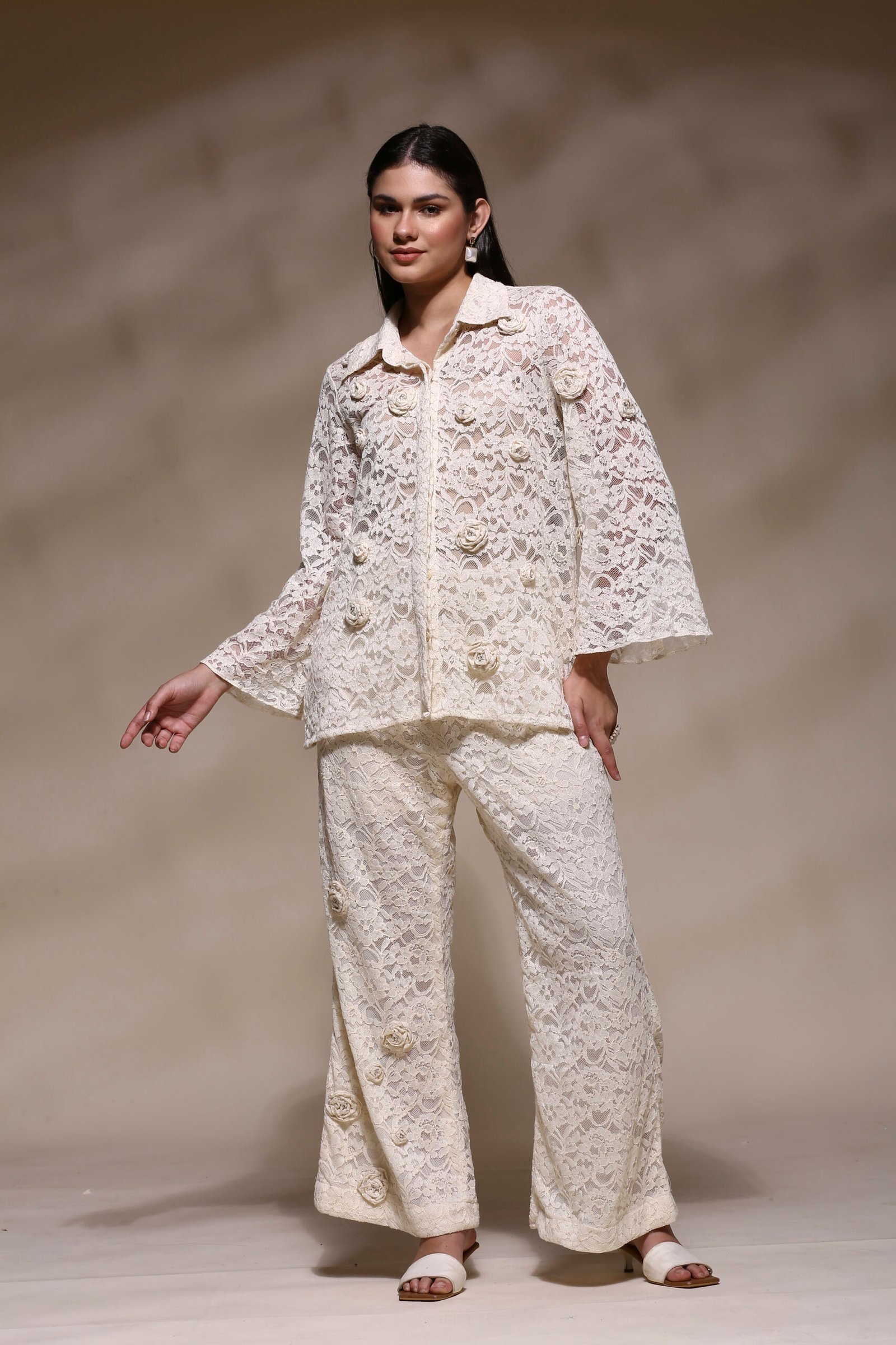 Grace meets glamour in this exquisitely designed Ivory Lace Co-Ord Set, a perfect ensemble for those who appreciate timeless elegance with a modern twist. Crafted entirely from premium lace fabric, this set features a full-sleeve shirt-style top and straight-fit pants, both adorned with delicate 3D floral appliqués for a soft, romantic touch.The semi-sheer lace top is designed with a classic shirt collar, front button closure, and a relaxed silhouette that flatters all body types. Paired with matching wide-leg pants, this set offers a breezy, confident look that transitions effortlessly from day events to evening soirées. Full lace construction in an elegant ivory tone. 3D hand-stitched floral appliqués on top and pants. Shirt-style top with button-down front and flared sleeves. Matching pants with comfortable waistband and floral detailing. Lightweight, breathable, and fully lined for modesty
