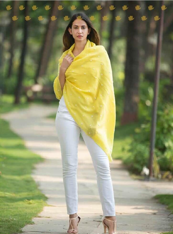 Yellow- White Thread Zardozi French Knot Gypso Embroidery Shawl