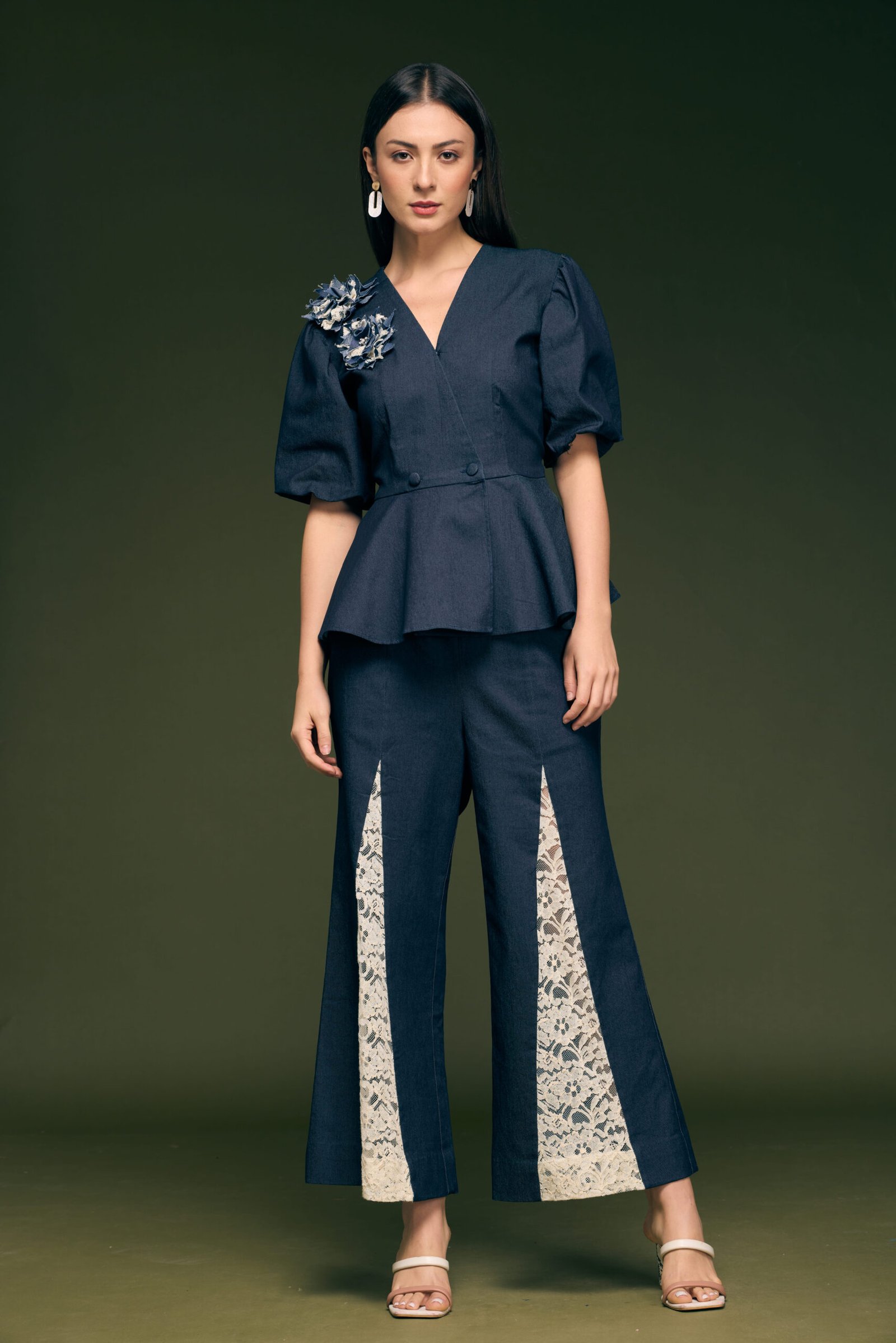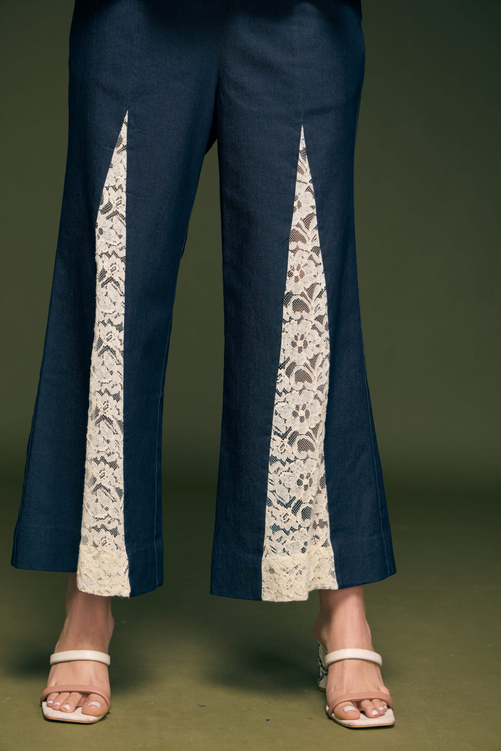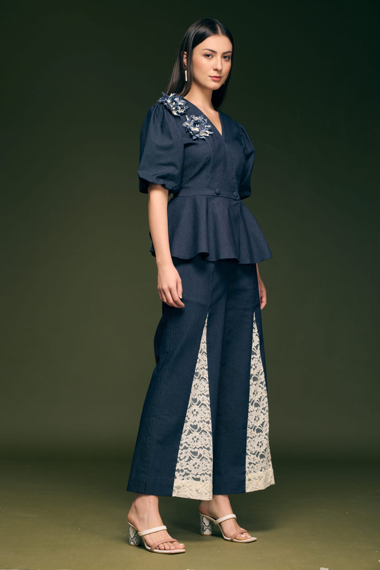 Blue Denim Papline Top With Hand Made Flower With Ivory Lace Fabric Attached On Flair Pant