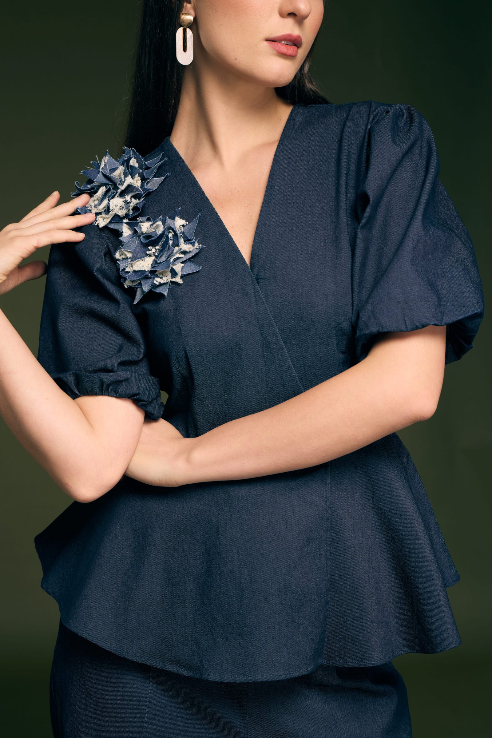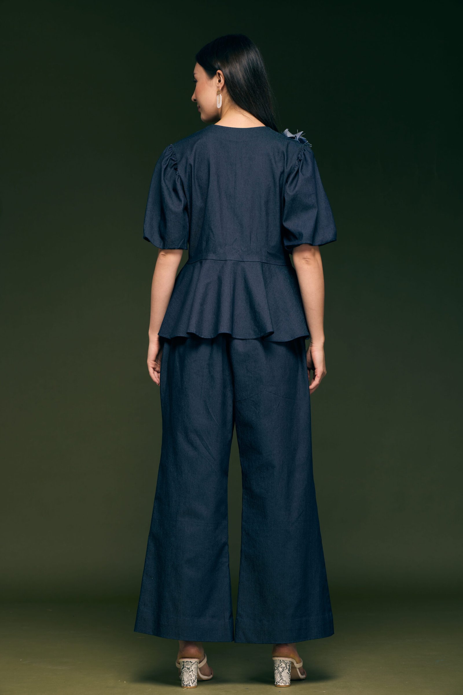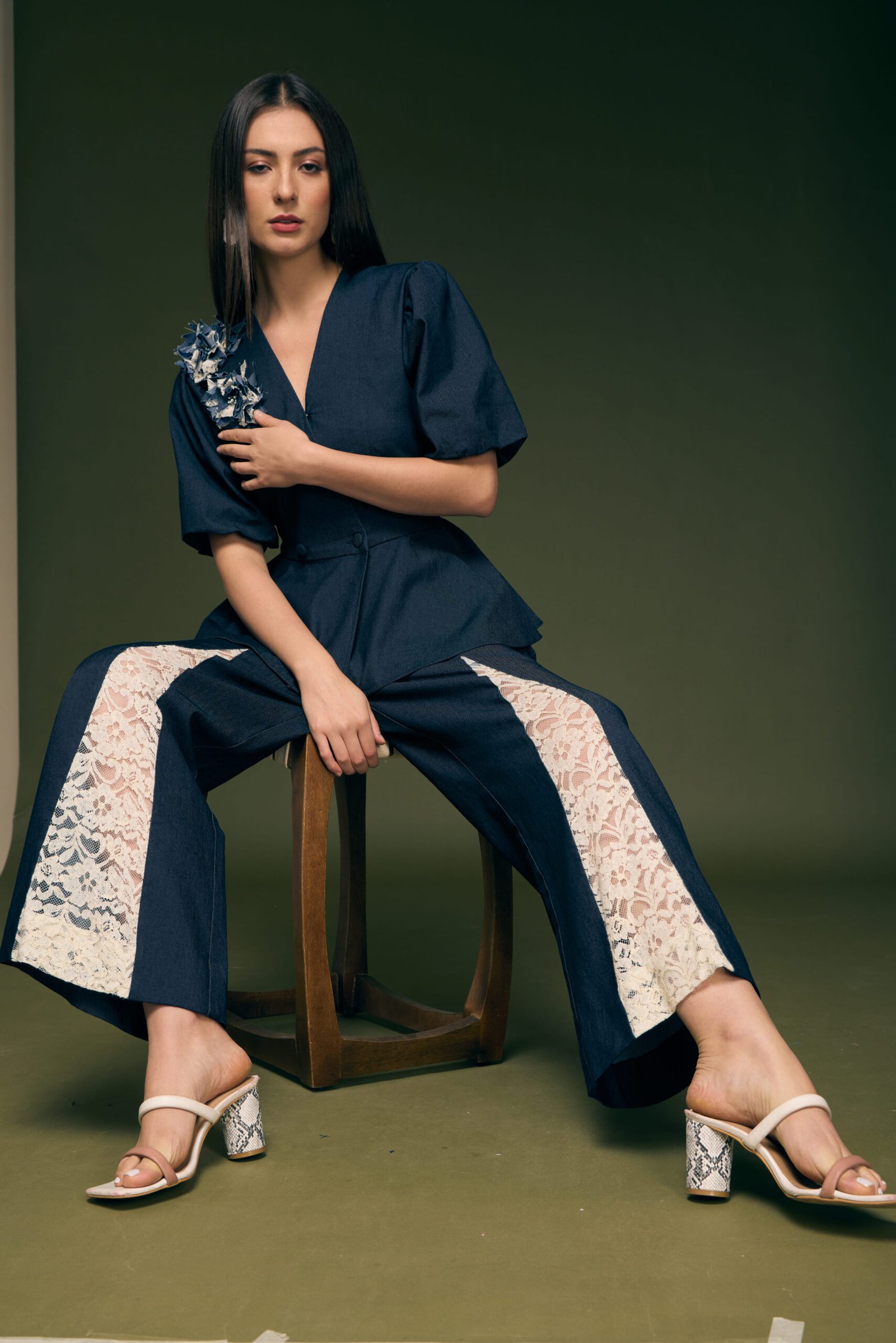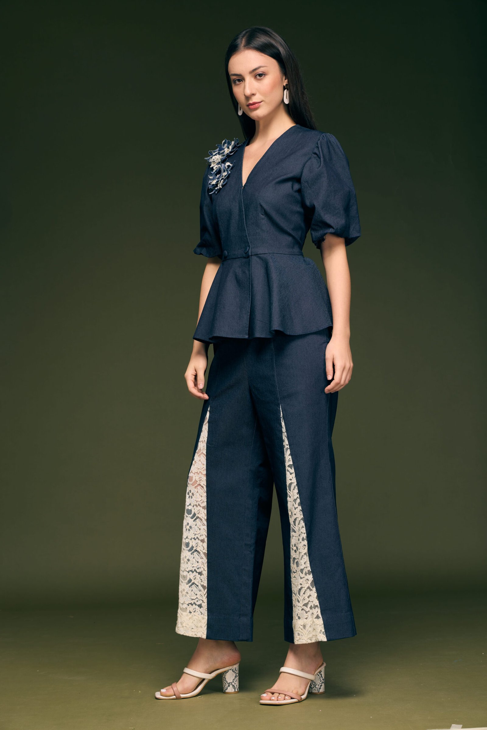 Blue Denim Papline Top With Hand Made Flower With Ivory Lace Fabric Attached On Flair Pant