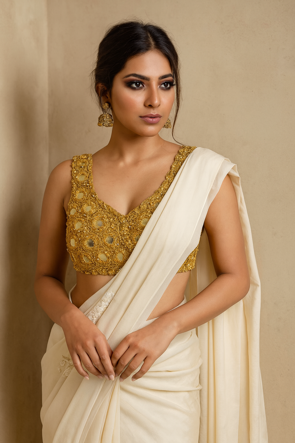 Turn heads with this dazzling gold blouse that fuses traditional mirror work with modern structure. Intricately hand-embroidered using shimmering threads and statement mirrors, the blouse offers an opulent yet contemporary aesthetic. The full-coverage, sleeveless design features a sculpted neckline and wide straps for both comfort and elegance.