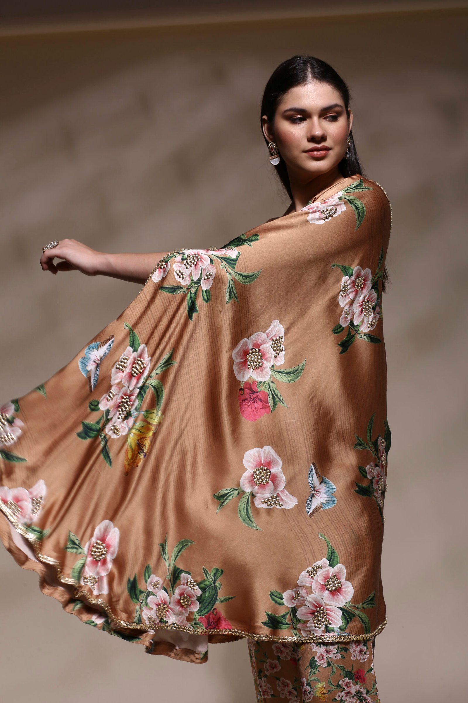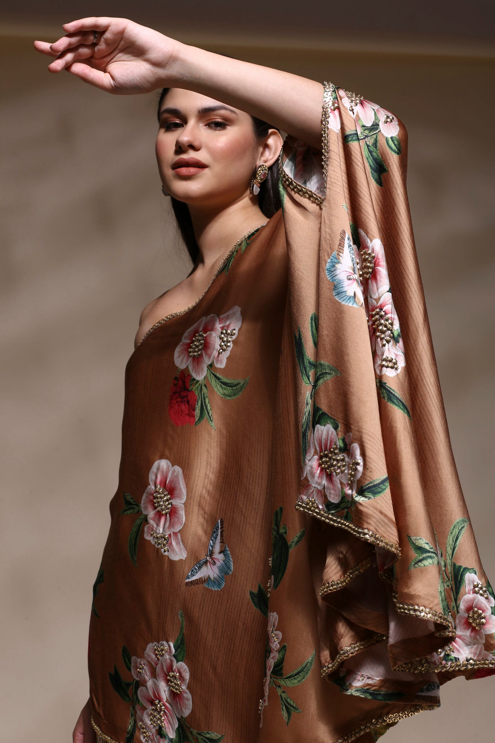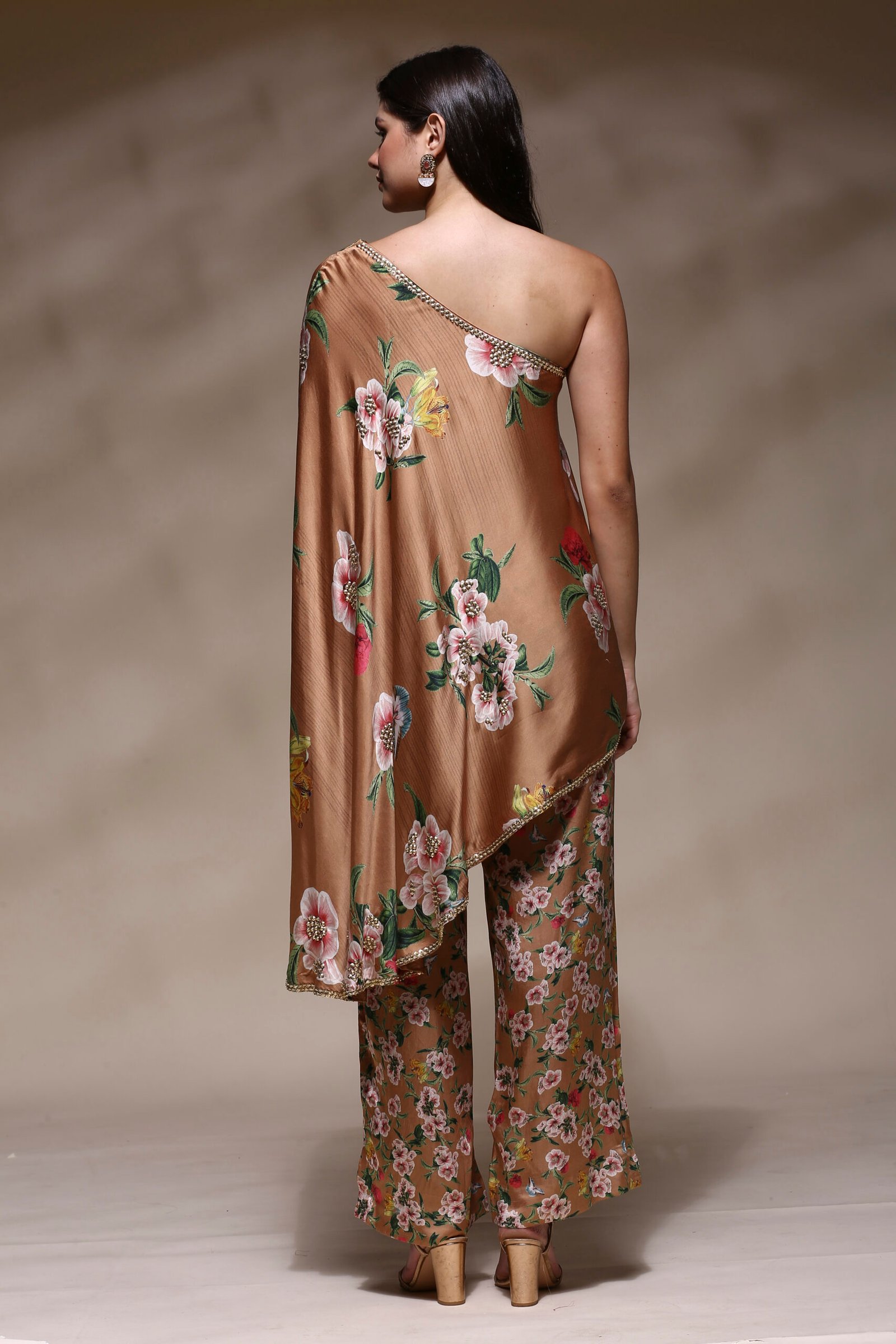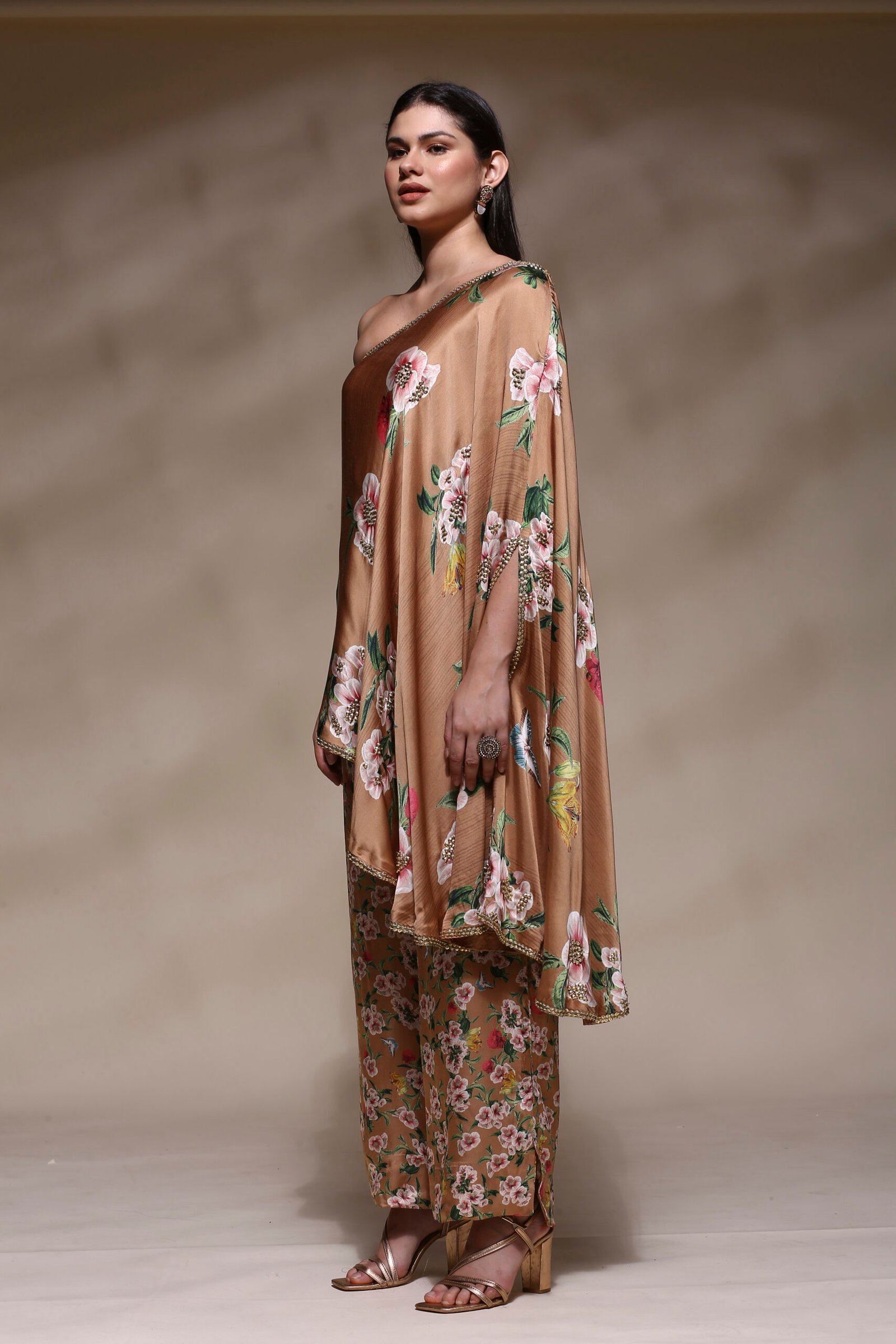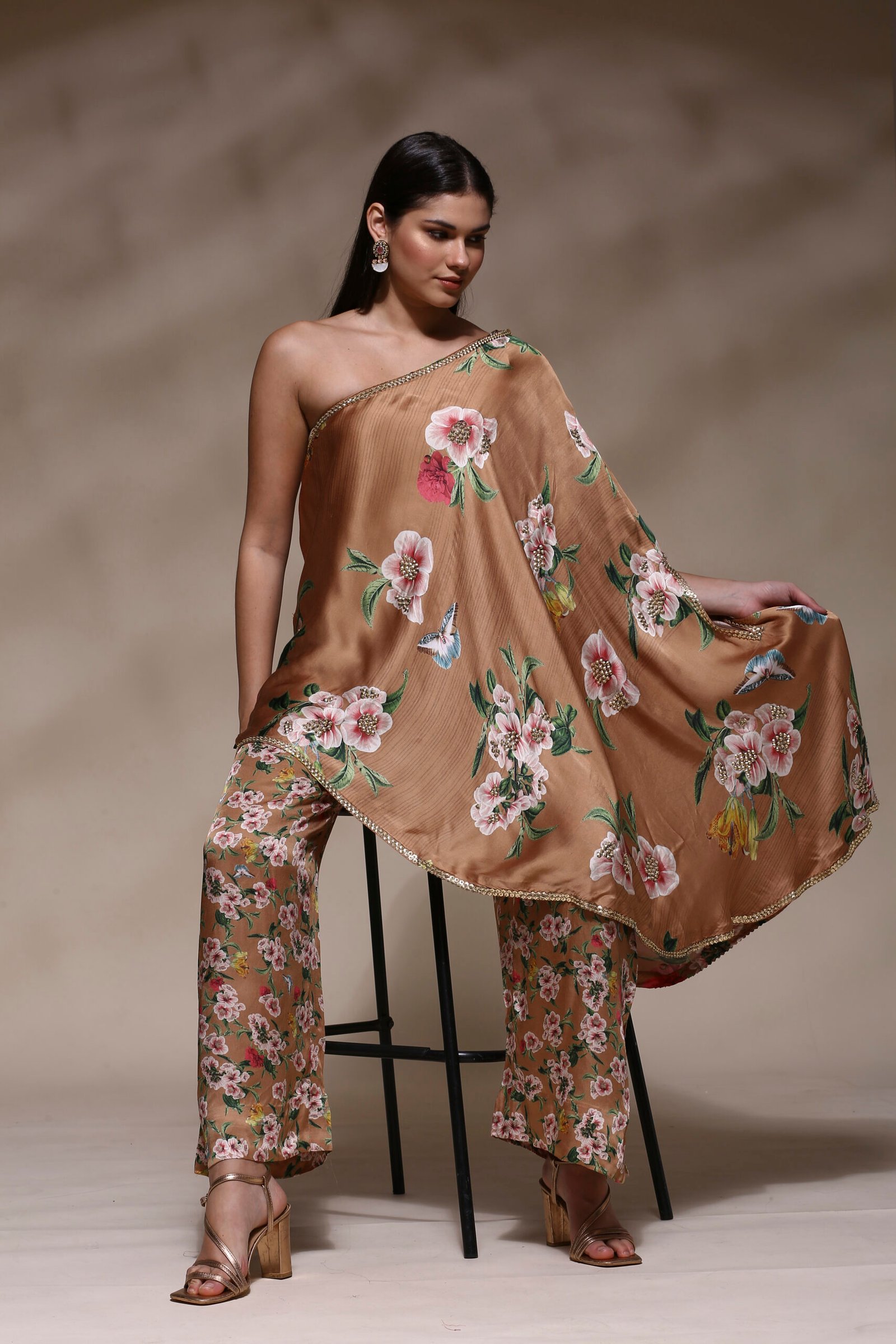 Elevate your style with this elegant and contemporary Floral One-Shoulder Asymmetric Kaftan Set, designed to blend sophistication with ease. Crafted from a luxurious satin-silk blend, this ensemble features a rich caramel brown base adorned with vibrant floral and butterfly prints that exude feminine charm and freshness. The kaftan-style top showcases a striking one-shoulder silhouette, gracefully draped with an asymmetric hemline for a modern, flowy appeal. Subtle hand-embellished detailing along the neckline and hem adds a refined touch of shimmer, perfect for festive occasions, cocktail evenings, or stylish get-togethers. The kaftan-style top showcases a striking one-shoulder silhouette, gracefully draped with an asymmetric hemline for a modern, flowy appeal. Subtle hand-embellished detailing along the neckline and hem adds a refined touch of shimmer, perfect for festive occasions, cocktail evenings, or stylish get-togethers.