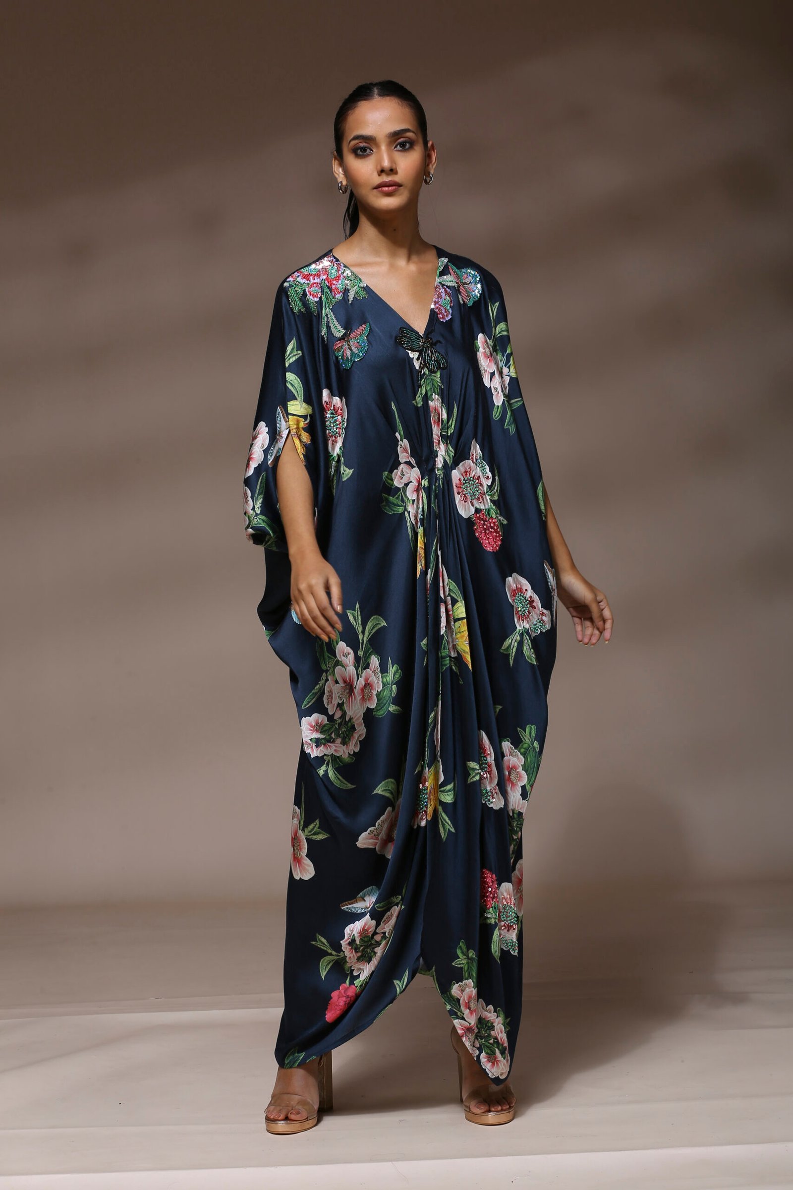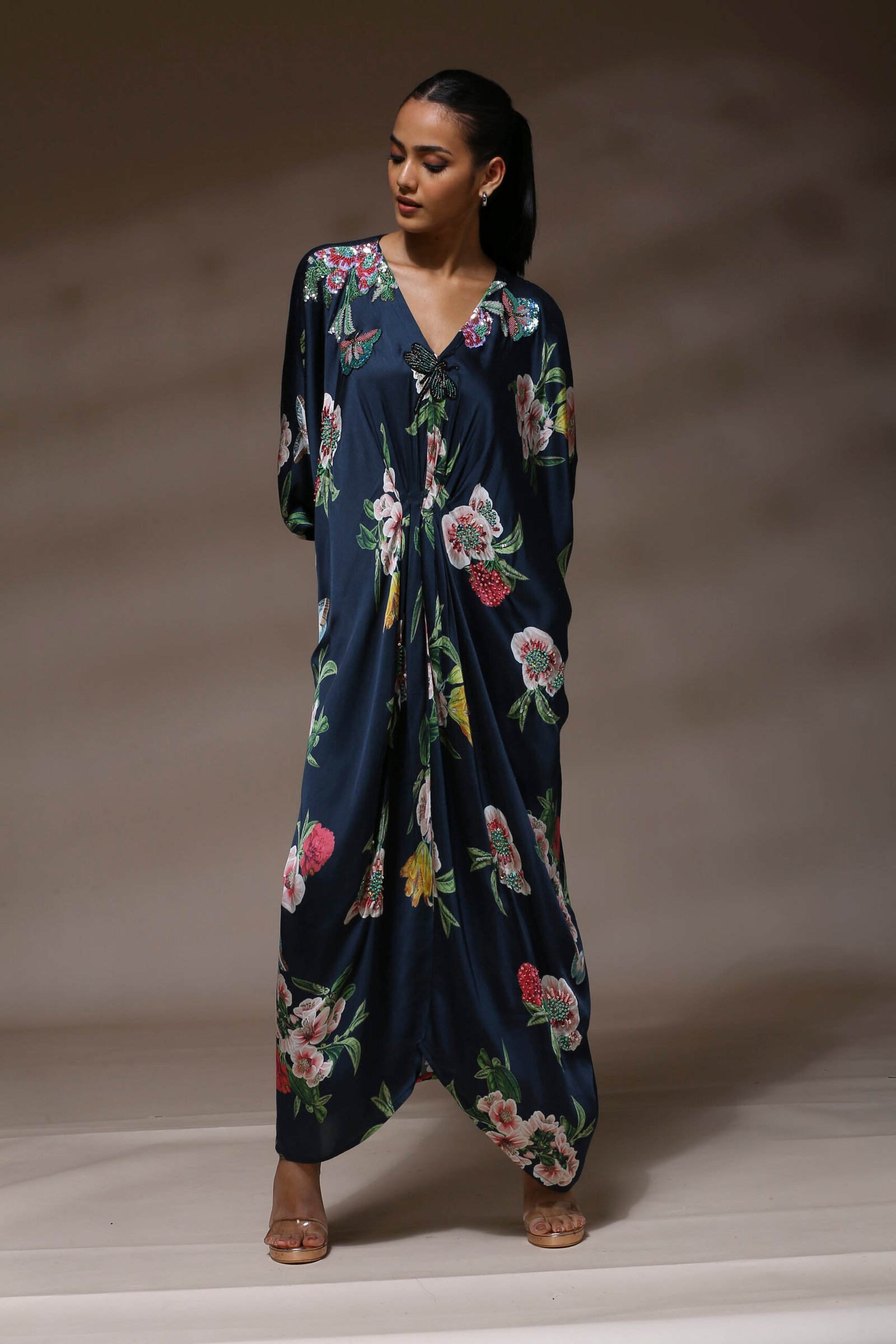 Fabric: Pure Modal Satin Silk Style: One-piece kaftan gown in navy satin with floral print Embroidery:Beads and sequins embroidery with drangonfly patches Elevate your wardrobe with the effortless elegance of the Padmasitaa Midnight Bloom Kaftan Gown. This striking silhouette is crafted from a luxurious navy satin base, adorned with vibrant floral motifs that evoke the serenity of a moonlit garden. The flowing kaftan-style cut drapes beautifully on all body types, offering both comfort and high-impact style. The V-neckline is subtly embellished with delicate beadwork and a standout statement butterfly applique at the center, adding a whimsical yet refined touch. With soft batwing sleeves and a front drape that cascades into a floor-grazing hem, this ensemble is your go-to for resort soirées, festive evenings, or cocktail affairs that demand a hint of drama. Care Instructions: Dry clean only