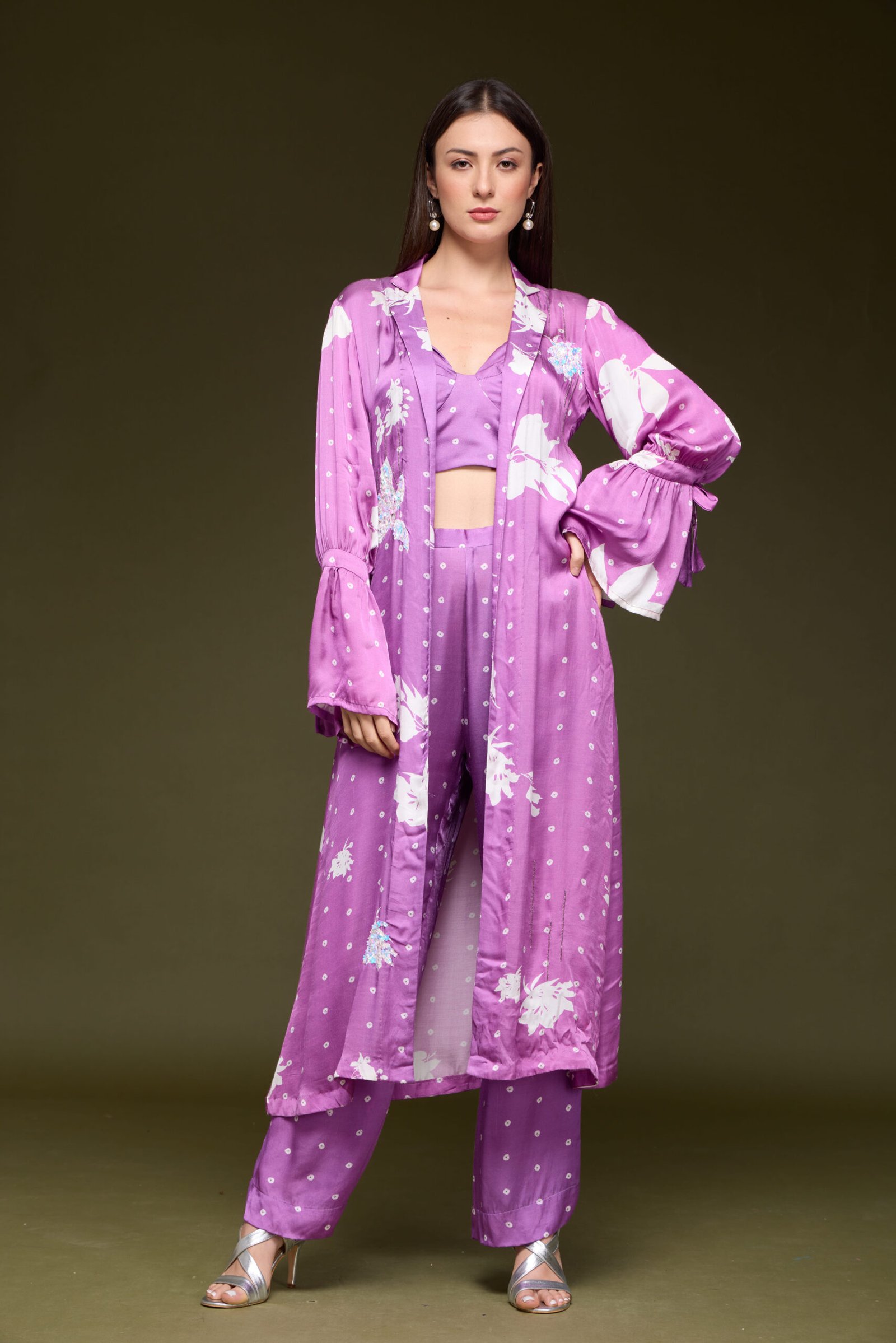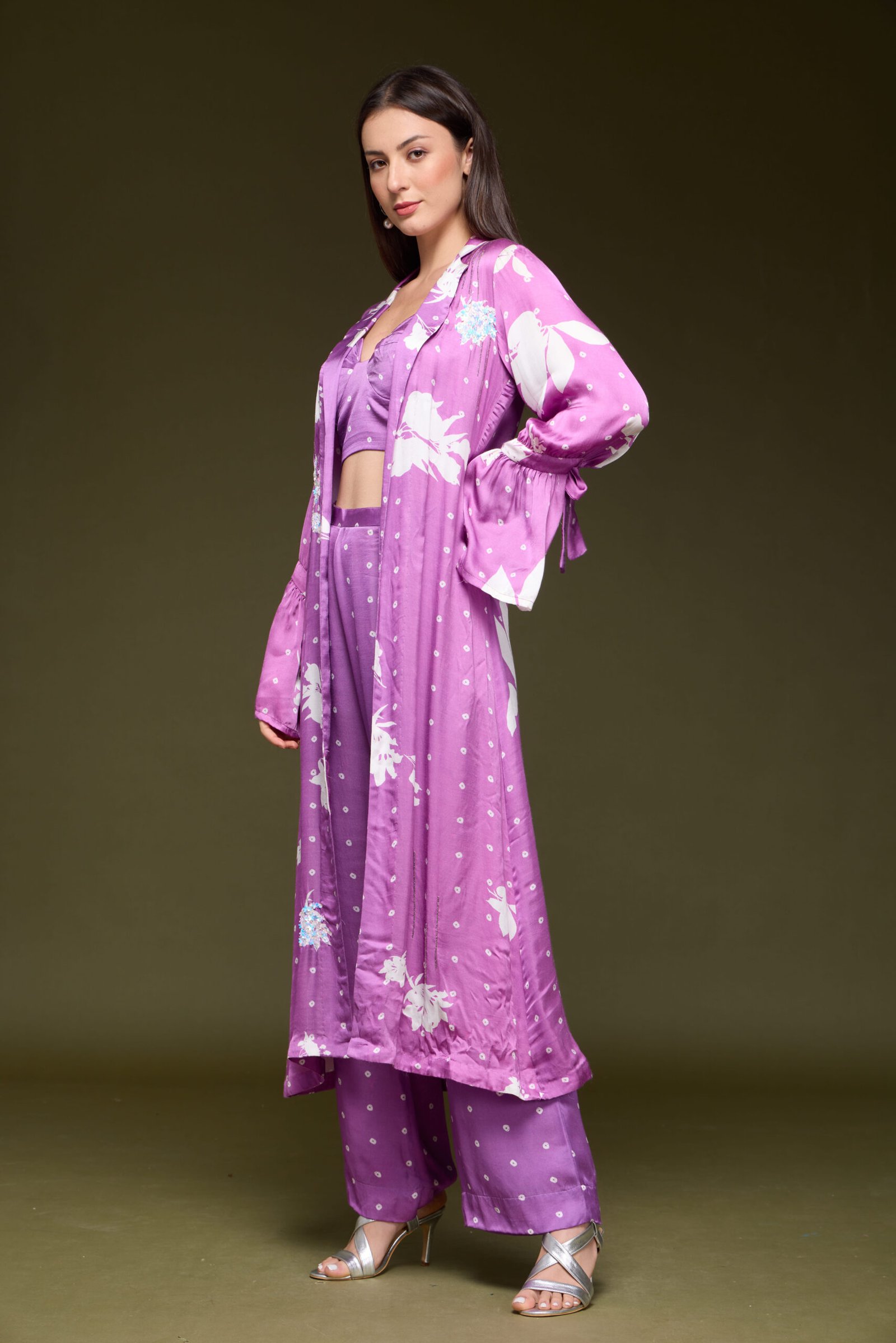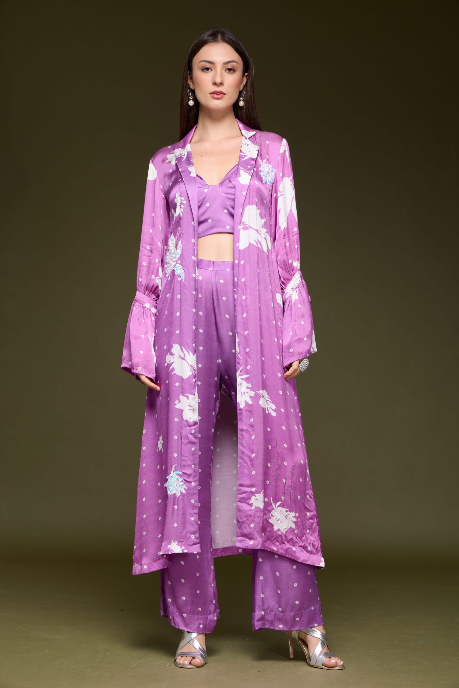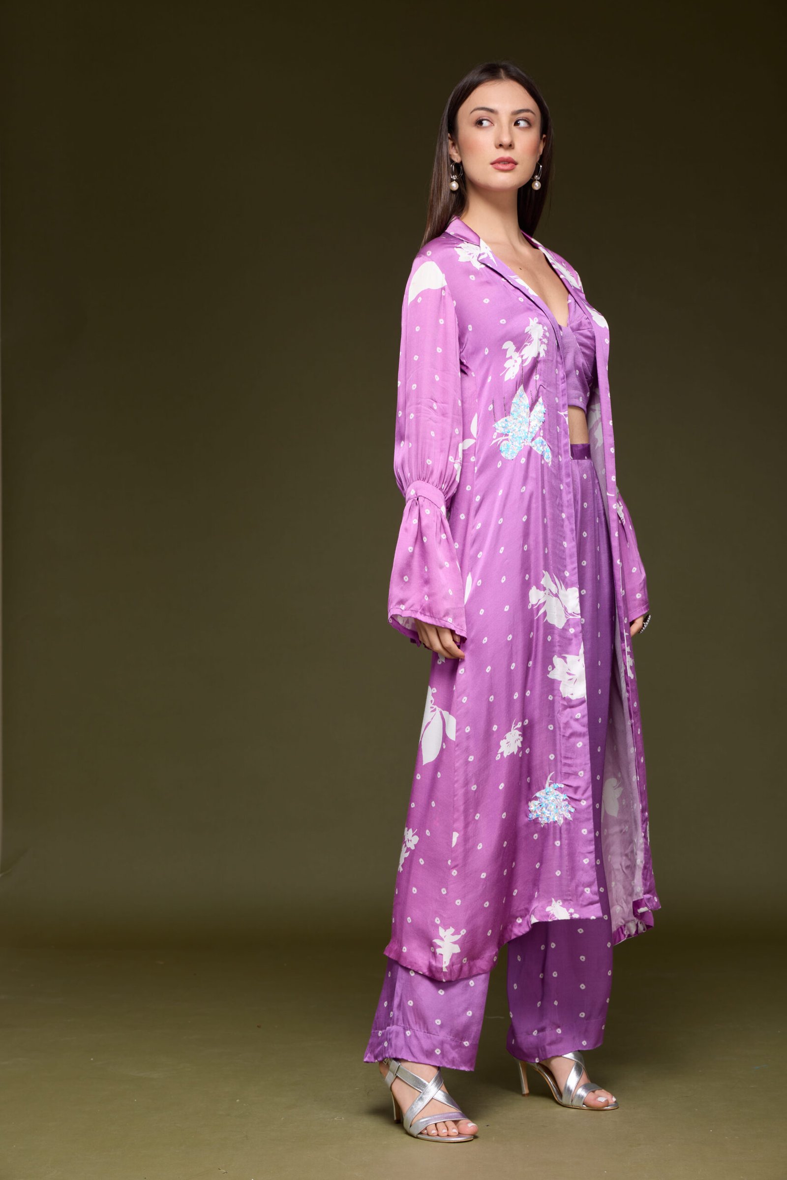 Fabric: Modal satin silk Color: Purple with Padmasitaa Bandhani and Lotus Print Includes: Emellished Long Jacket, Sculpted Bustier, Flared Pants Elevate your wardrobe with the Padmasitaa Purple Ensemble, a soft yet striking 3-piece co-ord set crafted in luxurious Modal Satin Silk. The soothing lilac base is adorned with a delicate Bandhani-inspired print and elegant lotus motifs, representing serenity and grace. The set features a long open-front jacket with hand-embellished sequin butterfly details that shimmer with subtle charm. Paired with a structured bustier and fluid flared pants, this look is both modern and rooted in tradition—ideal for daytime festivities, pre-wedding functions, or intimate gatherings.