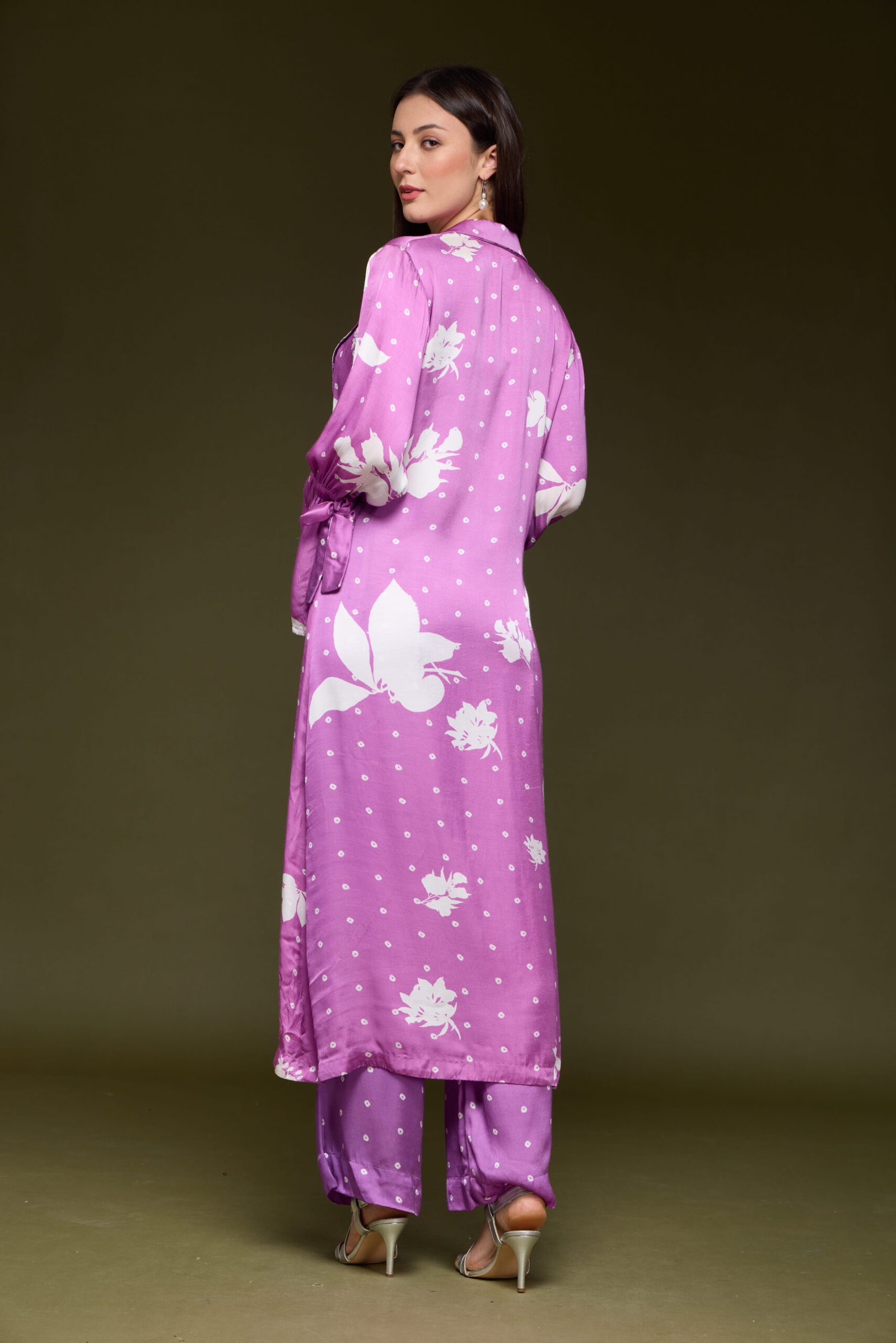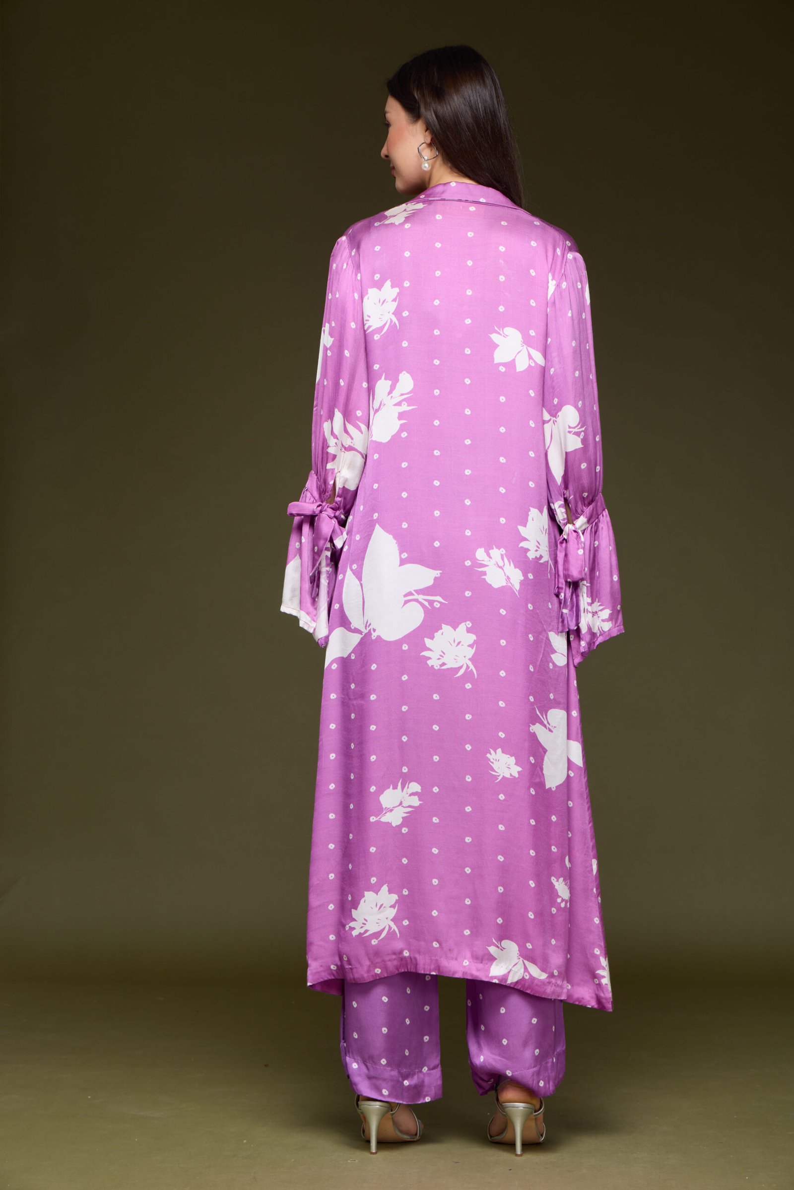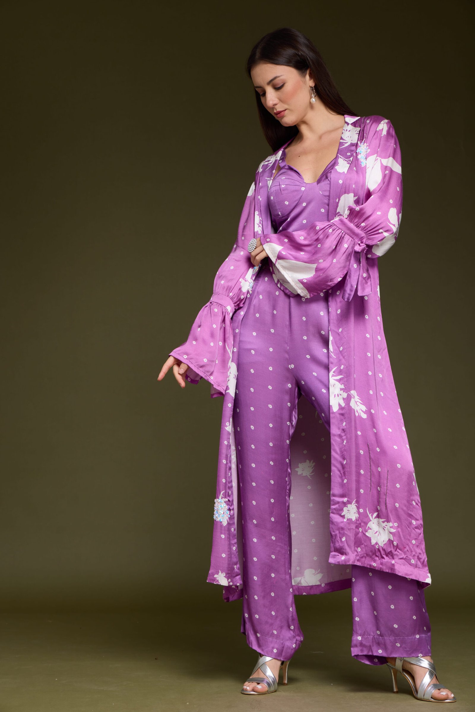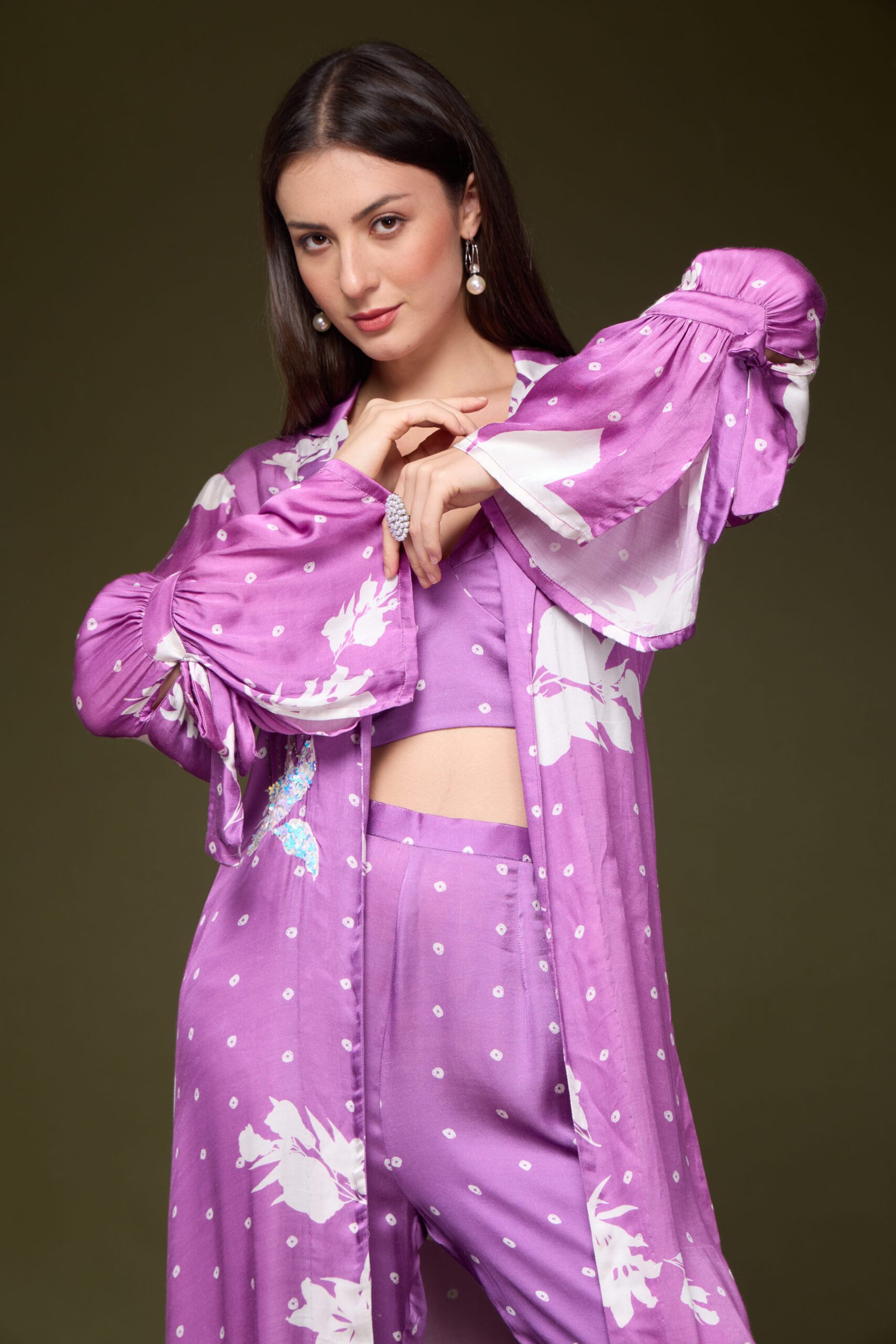 Fabric: Modal satin silk Color: Purple with Padmasitaa Bandhani and Lotus Print Includes: Emellished Long Jacket, Sculpted Bustier, Flared Pants Elevate your wardrobe with the Padmasitaa Purple Ensemble, a soft yet striking 3-piece co-ord set crafted in luxurious Modal Satin Silk. The soothing lilac base is adorned with a delicate Bandhani-inspired print and elegant lotus motifs, representing serenity and grace. The set features a long open-front jacket with hand-embellished sequin butterfly details that shimmer with subtle charm. Paired with a structured bustier and fluid flared pants, this look is both modern and rooted in tradition—ideal for daytime festivities, pre-wedding functions, or intimate gatherings.