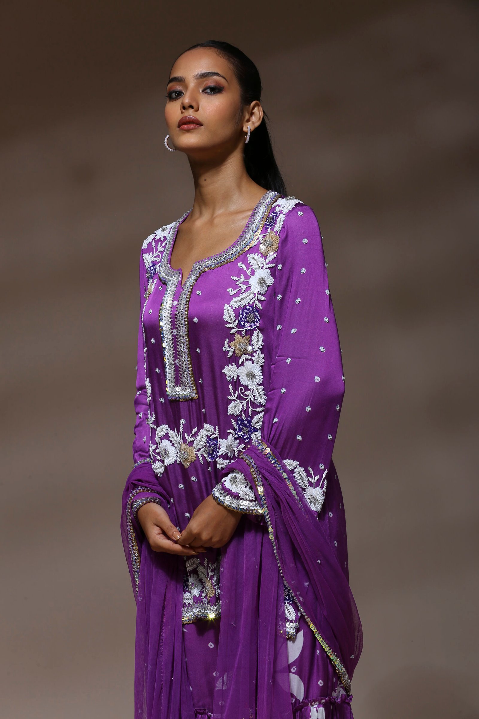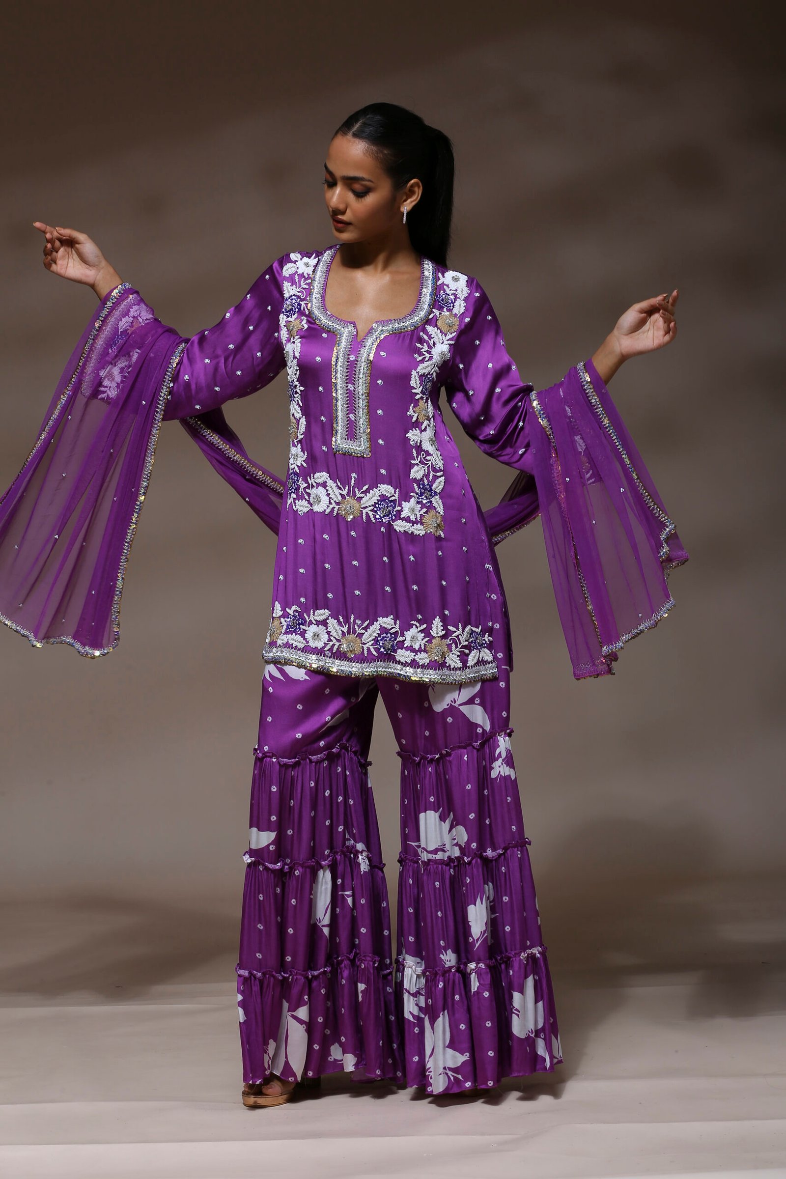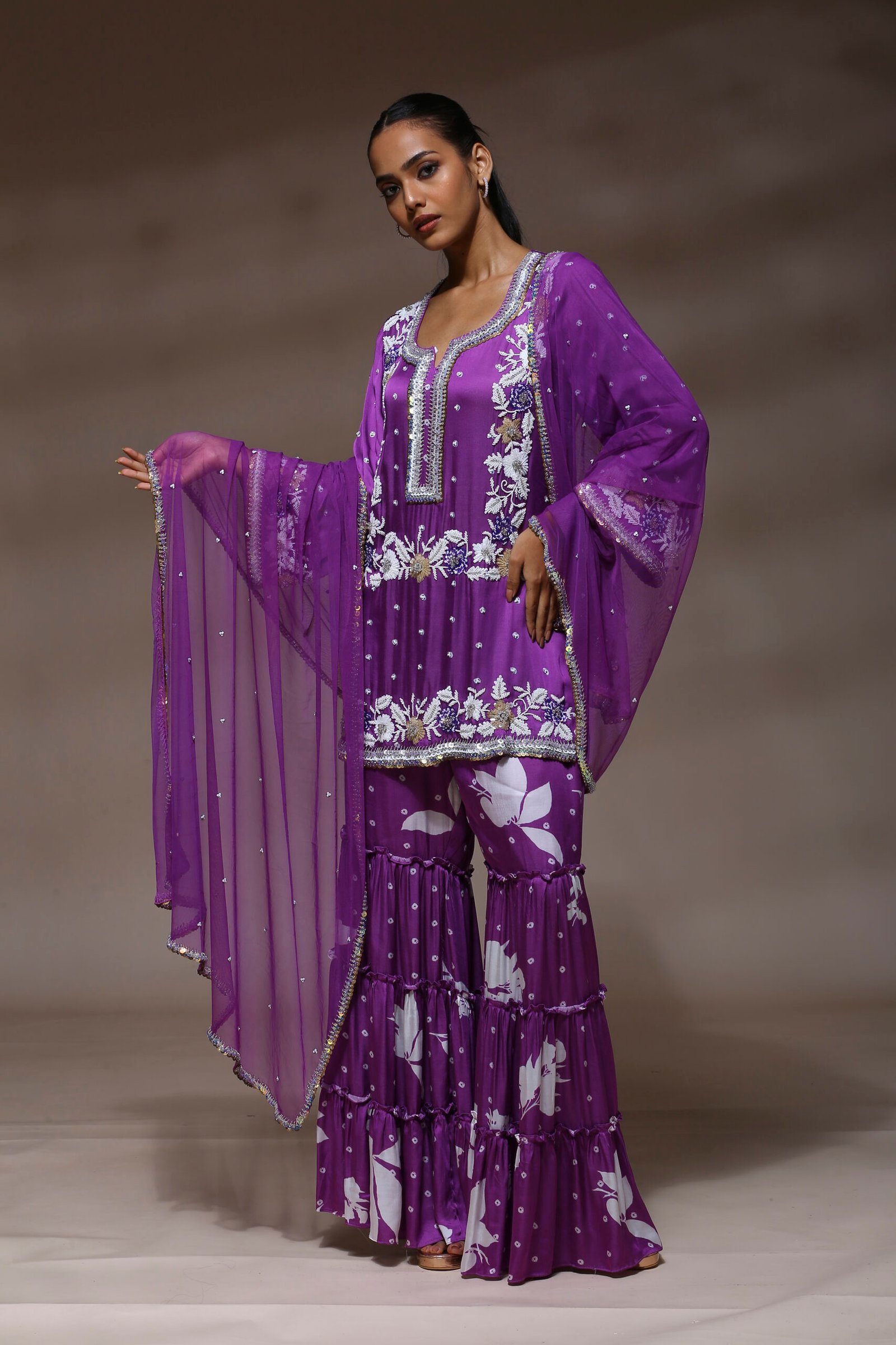 Fabric- Modal Satin Silk Color: Purple with small Padmasitaa floral print Embellishment- Beads with pearl and sequins Style: straight-cut kurta with coordinated sharara with multi-tier ruffles with all-over floral print and net dupatta Unveil your soft, romantic side with the Padmasitaa Rang Jamun Sharara Ensemble – a celebration of floral charm and regal finesse. This ethereal three-piece set is crafted in a pastel rose-pink tone, blooming with intricate floral motifs and illuminated with fine sequin embroidery. The kurta features a delicately hand-embellished neckline, hem, and sleeves, adding a layer of festive shimmer to the serene florals. The highlight of the set is the voluminous multi-tiered sharara pants that flow with every step, adding drama and elegance. A soft net dupatta, speckled with sequins and finished with embellished lace, completes the look, bringing in lightness and grace. Designed for pre-wedding functions, brunch soirees, or Eid celebrations, this outfit speaks of timeless beauty with a touch of modern glamour.