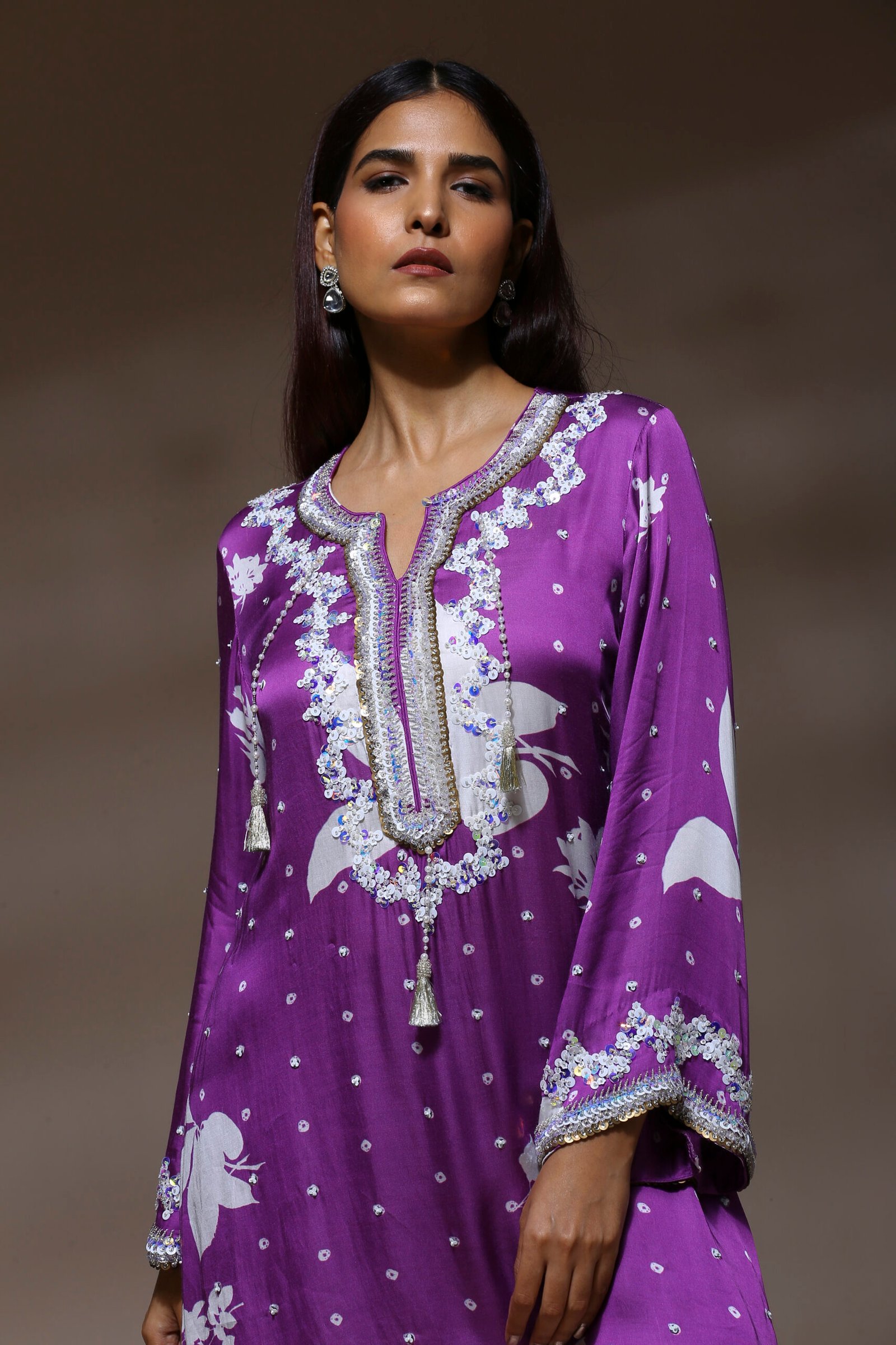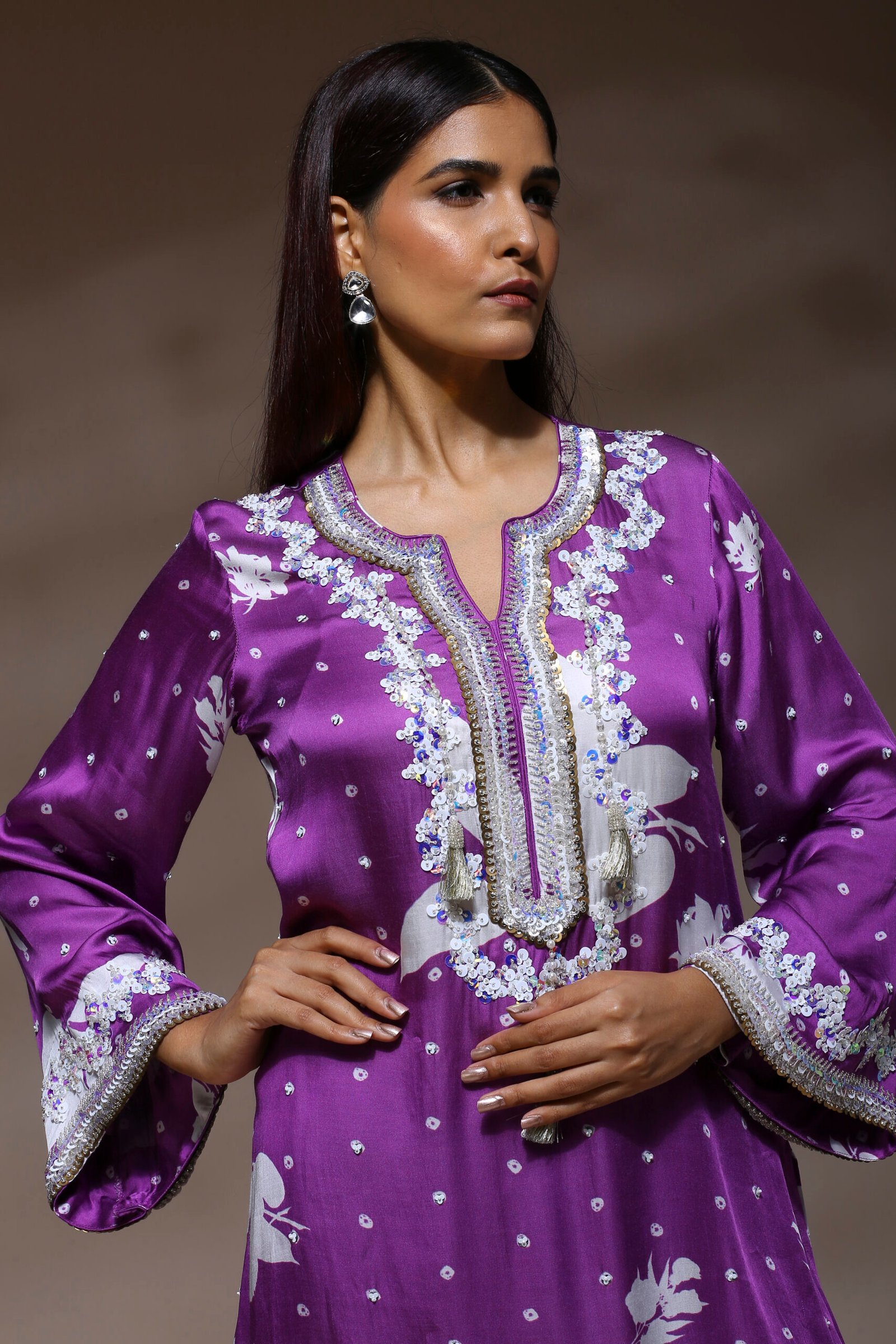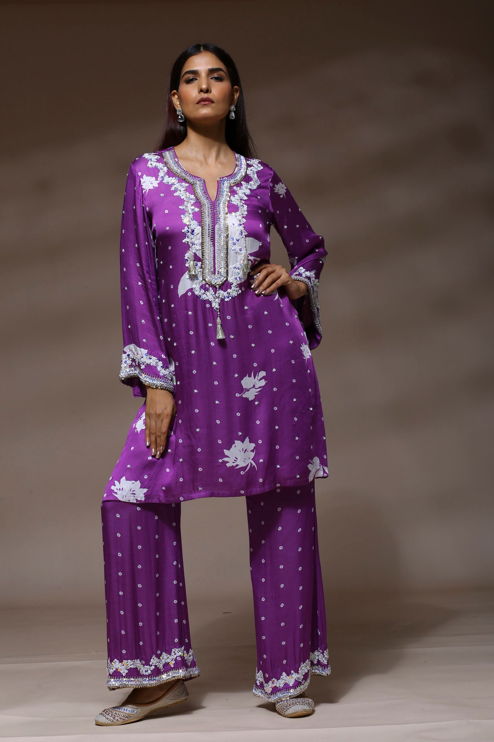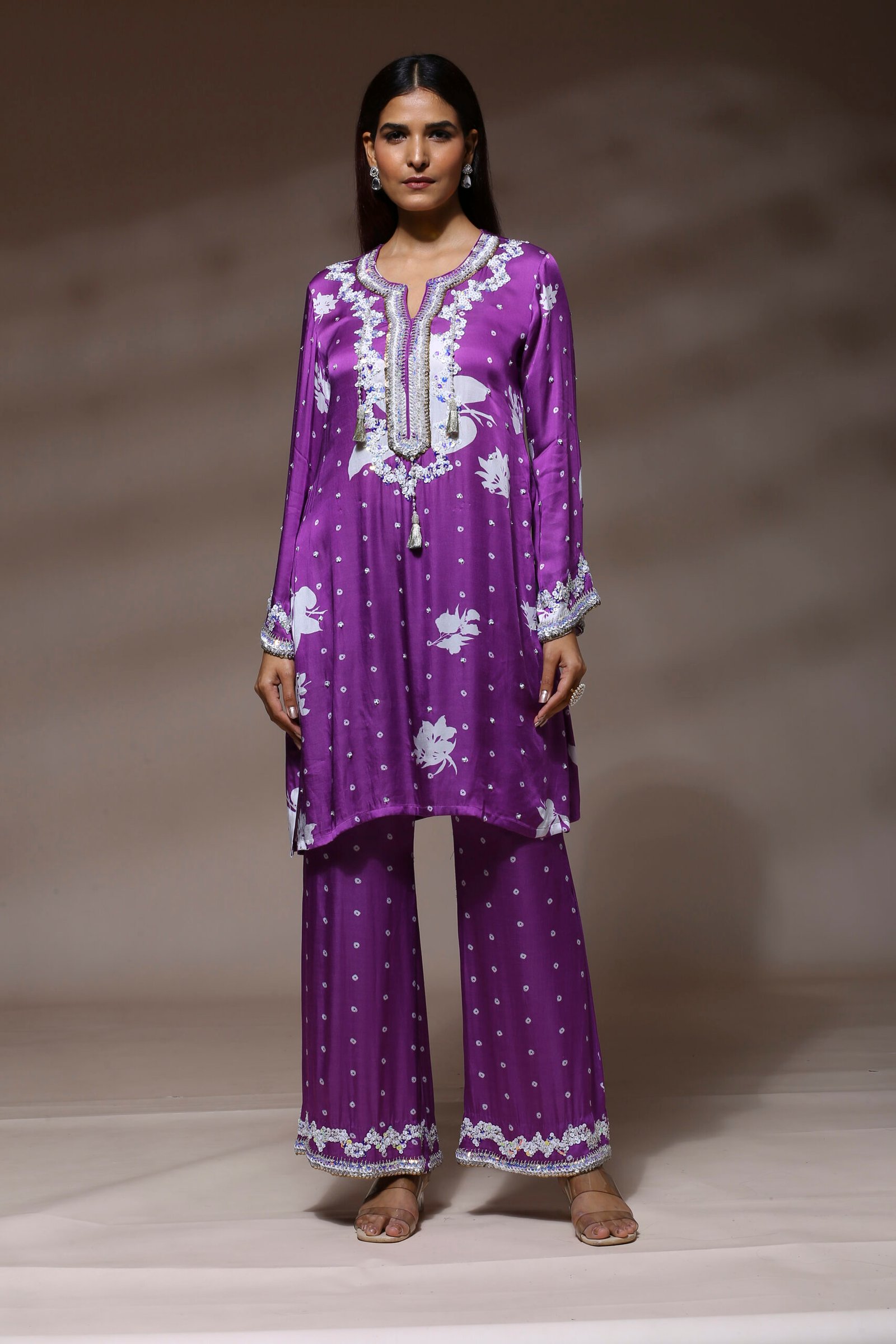 Fabric- Pure modal satin silk Style- straight-cut silhouette with long sleeves and a hip-length hemline and matching wide-leg trousers Embroidery- heavy embroidery in silver and white tones using sequins, threadwork, and beading for a regal finish. Elevate your traditional wardrobe with our Royal Amethyst Embroidered Ensemble, a stunning fusion of elegance and comfort. This vibrant two-piece outfit in a rich, jewel-toned purple is adorned with intricate embellishments and delicate floral motifs, perfect for festive occasions, intimate gatherings, or refined everyday wear. Care Instructions: Dry clean recommended to maintain embroidery and fabric sheen.