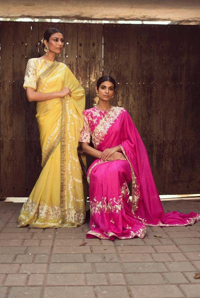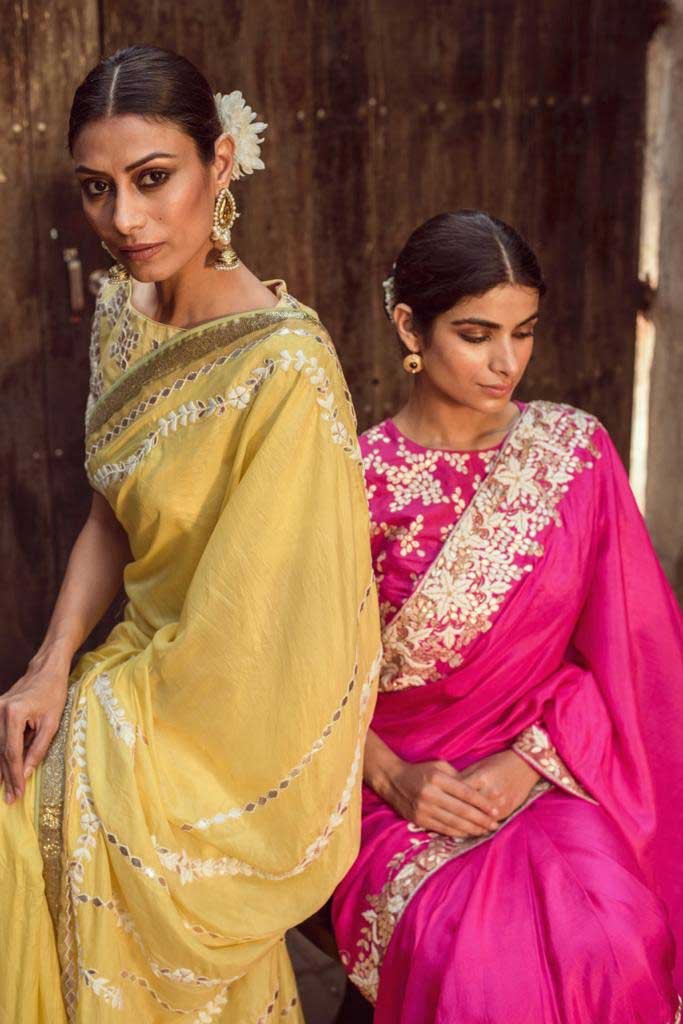 Rani Pink South Silk 4 Side White thread zardozi with Gota Embroidered Saree With blouse