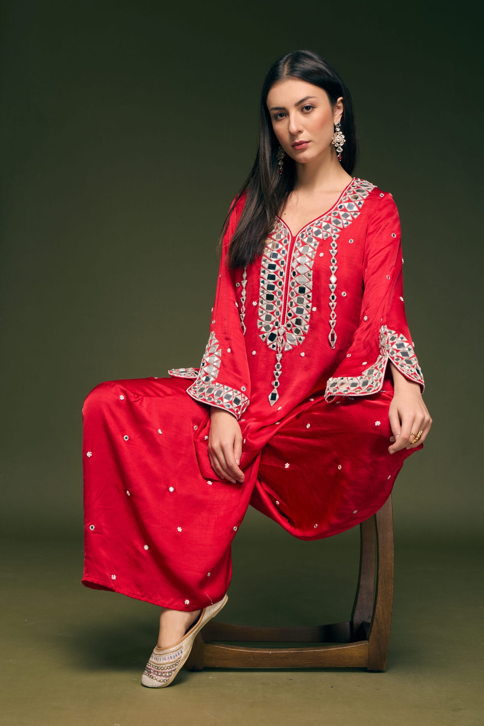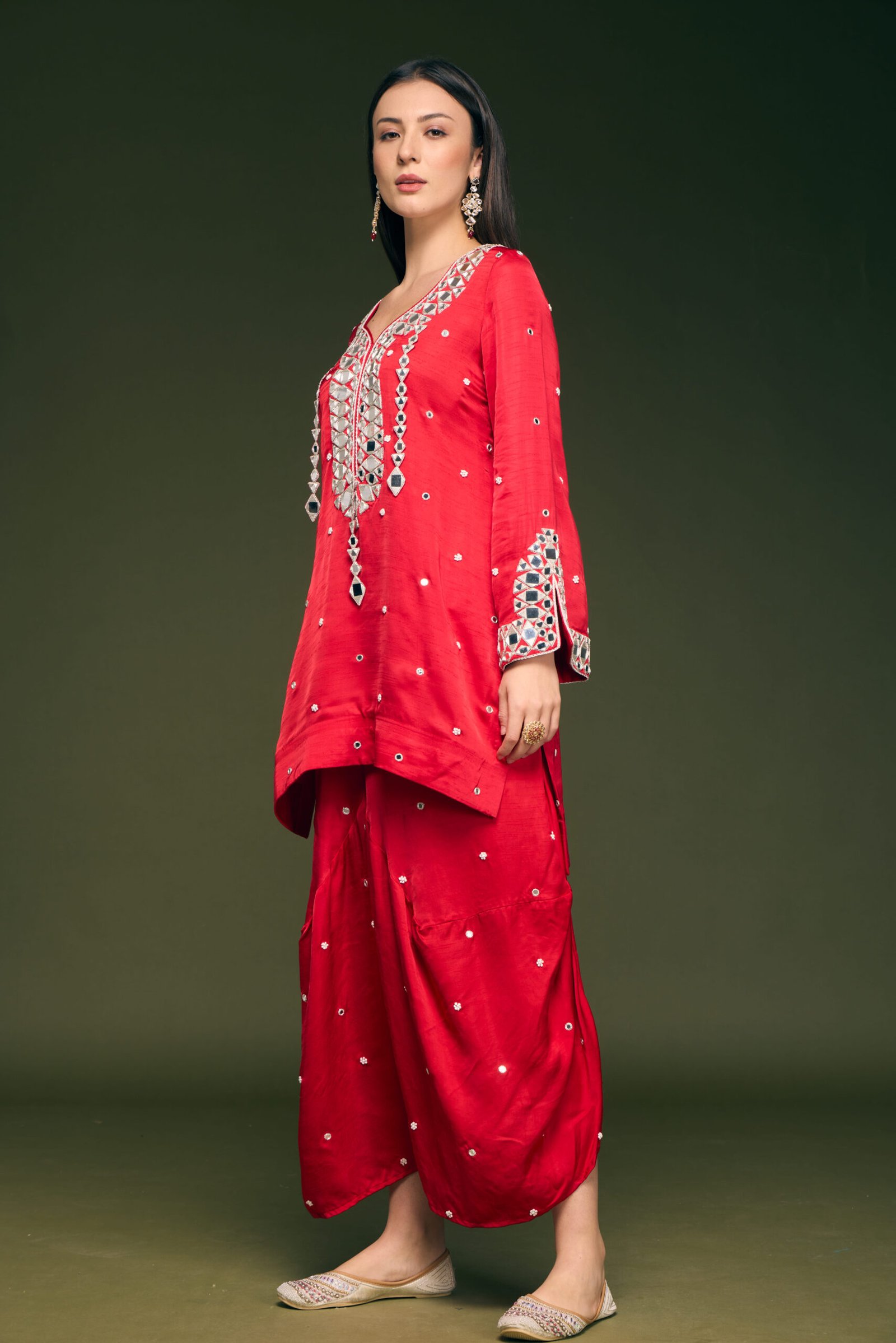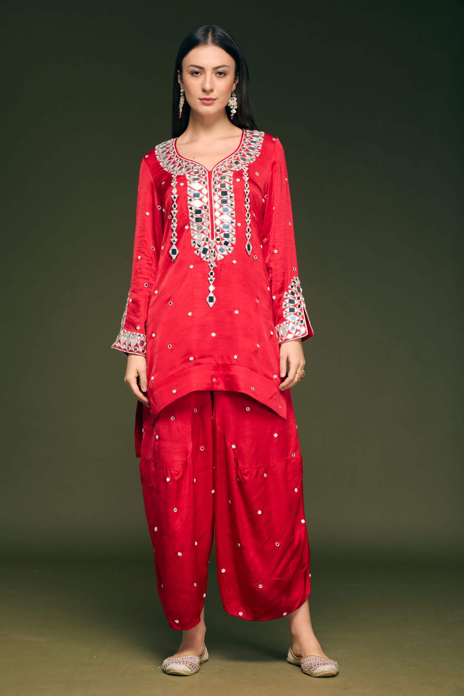 Fabric:Dupion Satin Style:Deep round/V-cut with mirror panel and unstructured pants Embellishment:Hand-stitched mirror work and White Zardozi knot with mirror chhita Turn heads with this radiant mirror work kurta set, perfect for festive gatherings and celebratory occasions. Featuring intricate hand-embellished mirror work on the neckline and sleeves, these sets blend tradition with vibrant style. The kurta is paired with a classic dhoti-style salwar for a timeless yet playful silhouette.