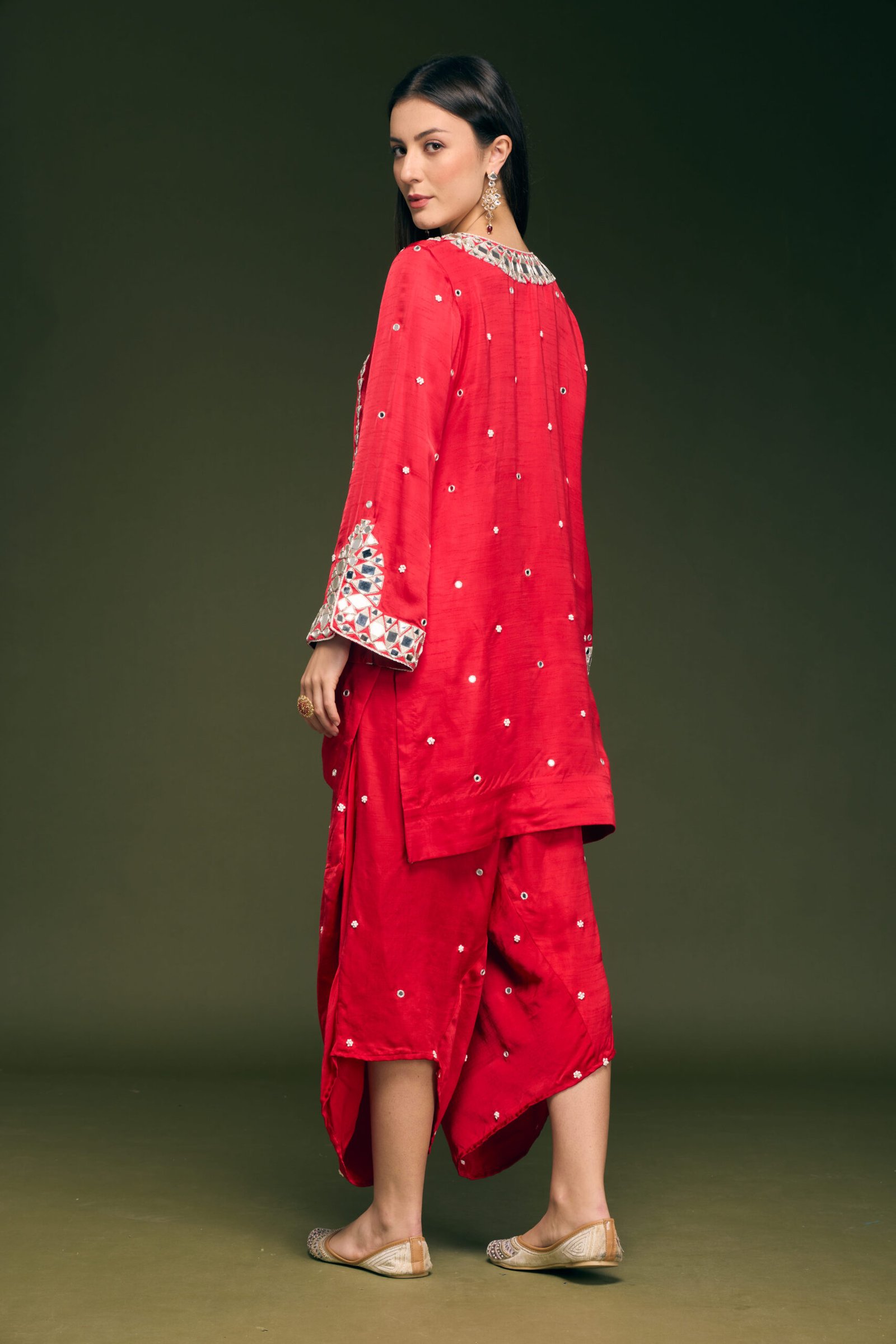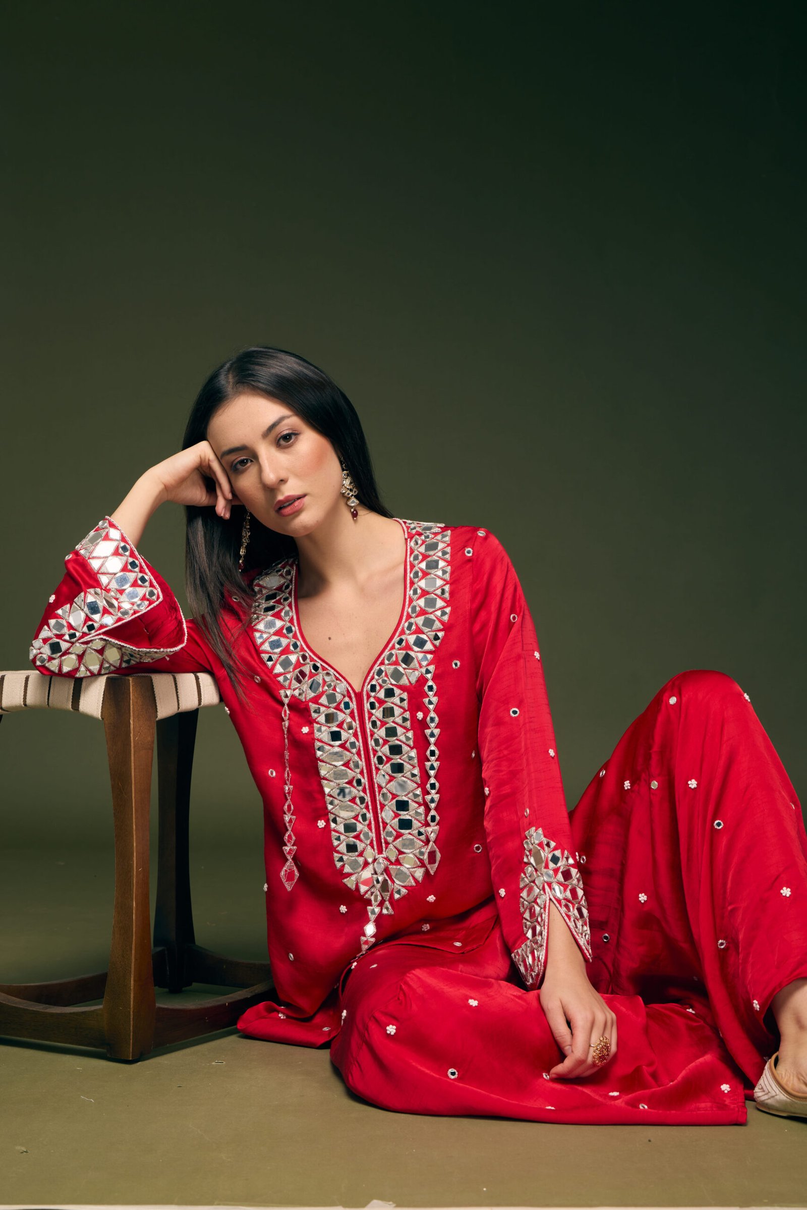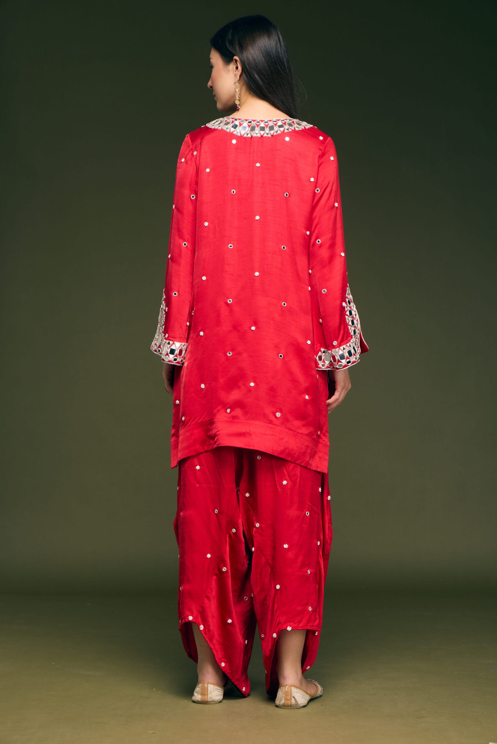 Fabric:Dupion Satin Style:Deep round/V-cut with mirror panel and unstructured pants Embellishment:Hand-stitched mirror work and White Zardozi knot with mirror chhita Turn heads with this radiant mirror work kurta set, perfect for festive gatherings and celebratory occasions. Featuring intricate hand-embellished mirror work on the neckline and sleeves, these sets blend tradition with vibrant style. The kurta is paired with a classic dhoti-style salwar for a timeless yet playful silhouette.