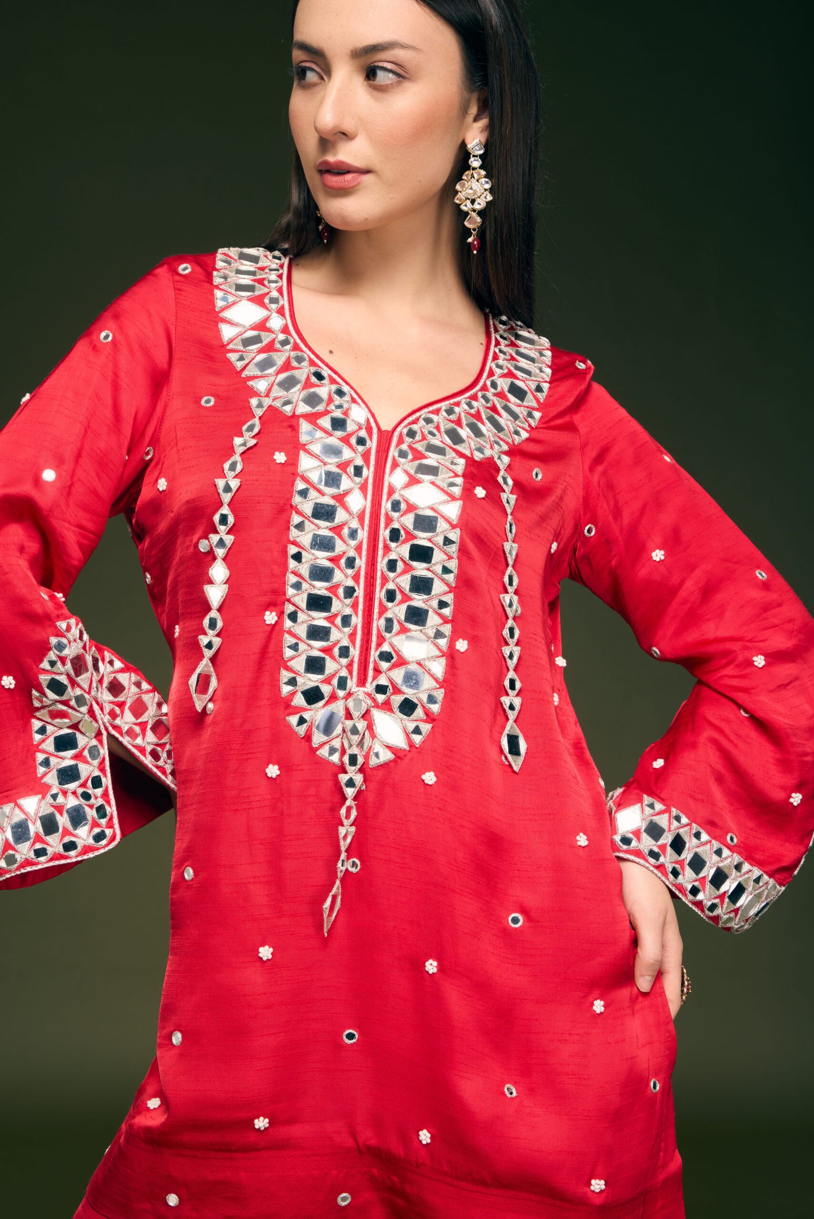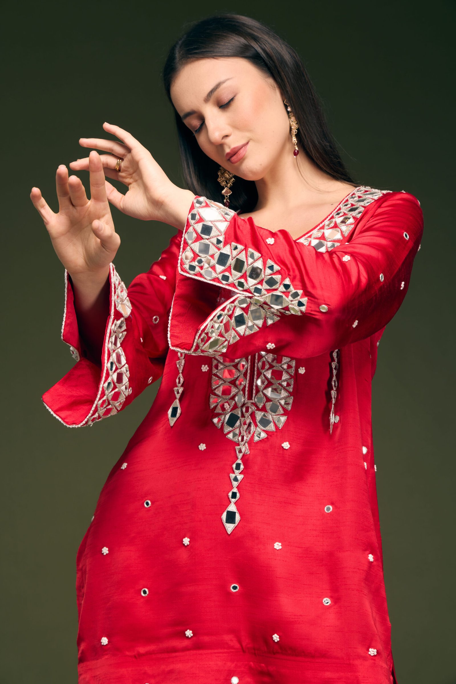 Red Dupion Satin With Mirror And White Zardozi Knot With Mirror Chhita Top With Unstructured Pant