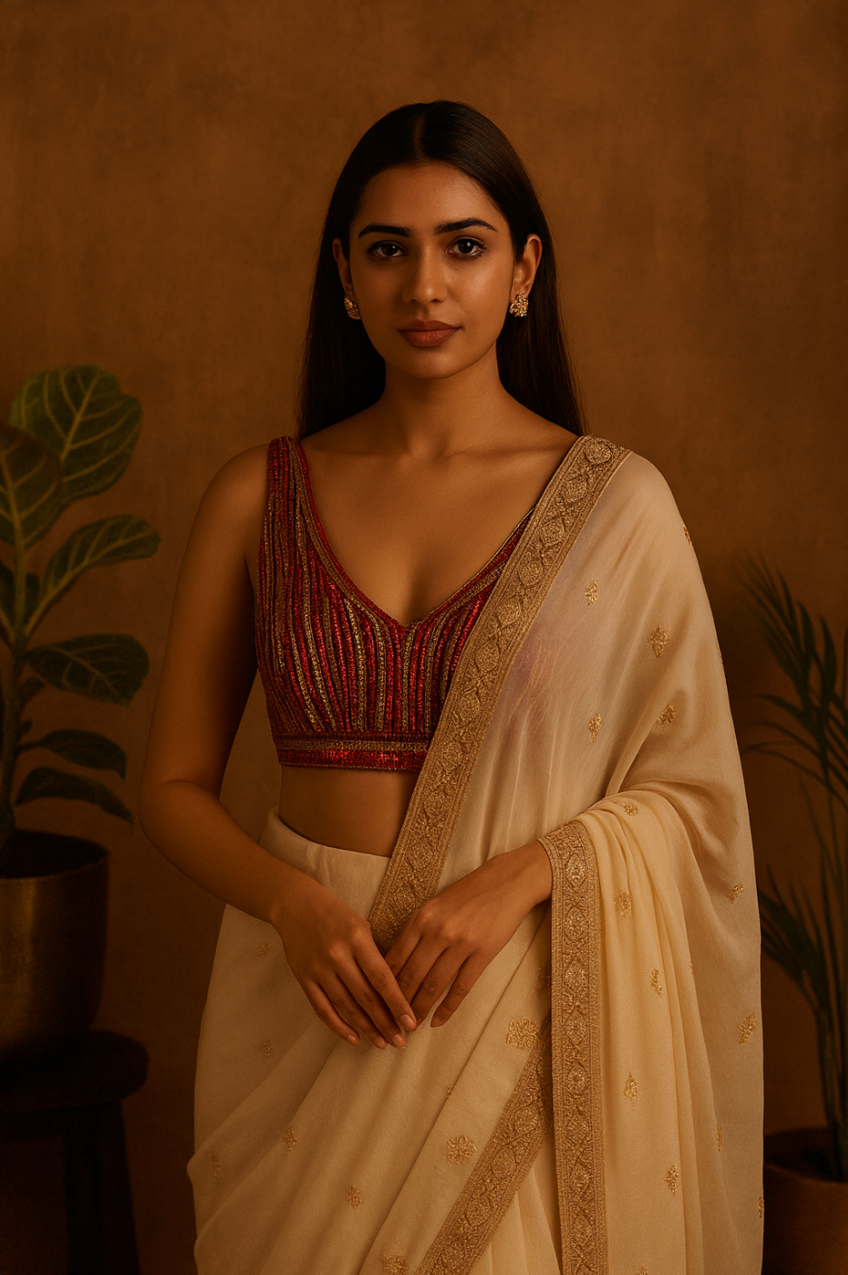 Radiate glamour and sophistication with this Scarlet Sequin Embellished Blouse, a perfect blend of bold allure and timeless elegance. Handcrafted with precision, this sleeveless blouse features a deep V-neckline that beautifully contours the neckline, exuding a modern yet classic charm. The rich scarlet red base is adorned with gold and crimson sequins, meticulously arranged in vertical patterns that create a stunning play of light and movement. The back design showcases a sensuous deep cut with delicate tie-up detailing, finished with beaded tassels for a touch of refinement and adjustability. Crafted on a smooth, flexible base fabric, this blouse ensures both comfort and a flattering fit. Ideal for pairing with sarees, lehengas, or draped ensembles, it instantly elevates your festive or evening look.