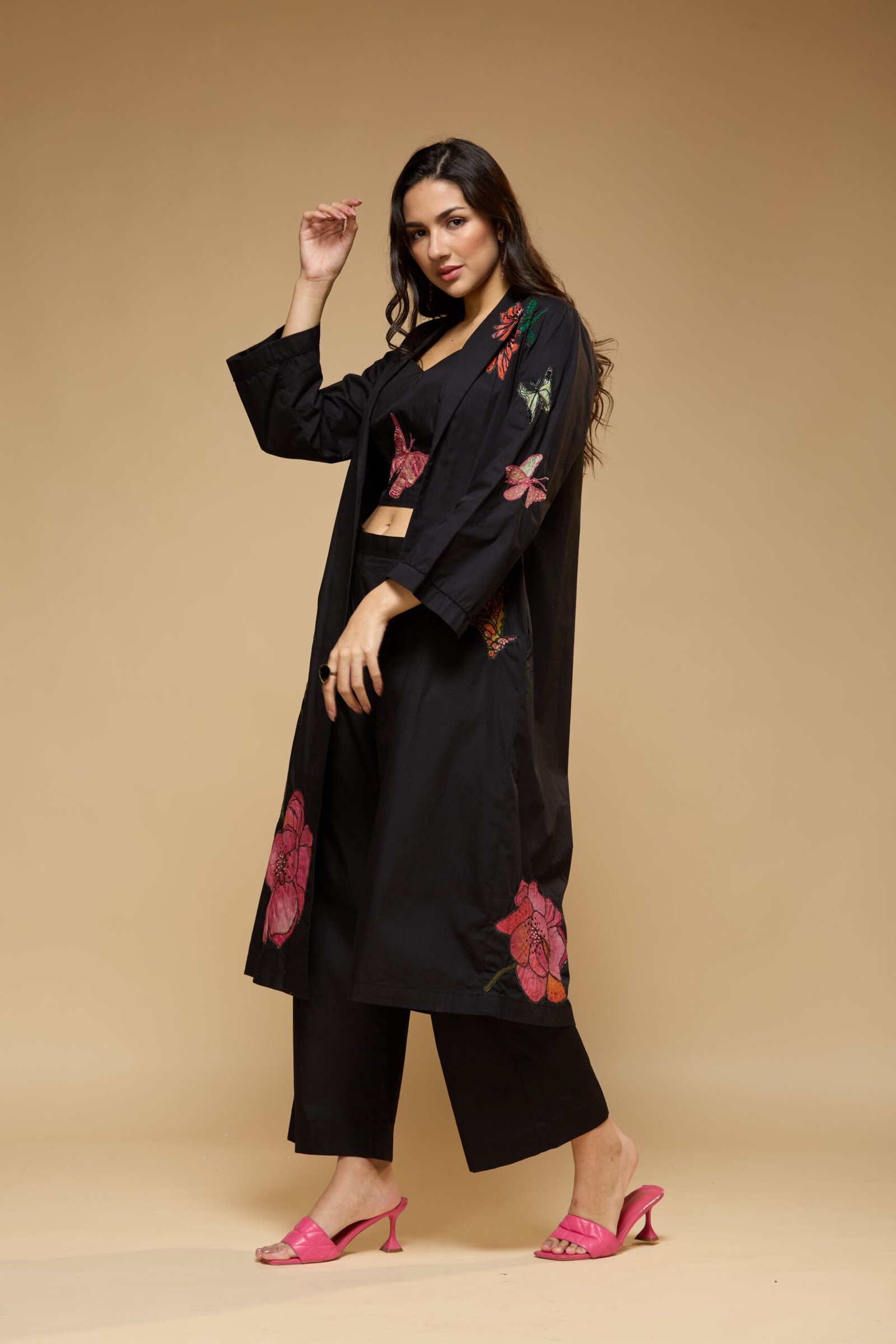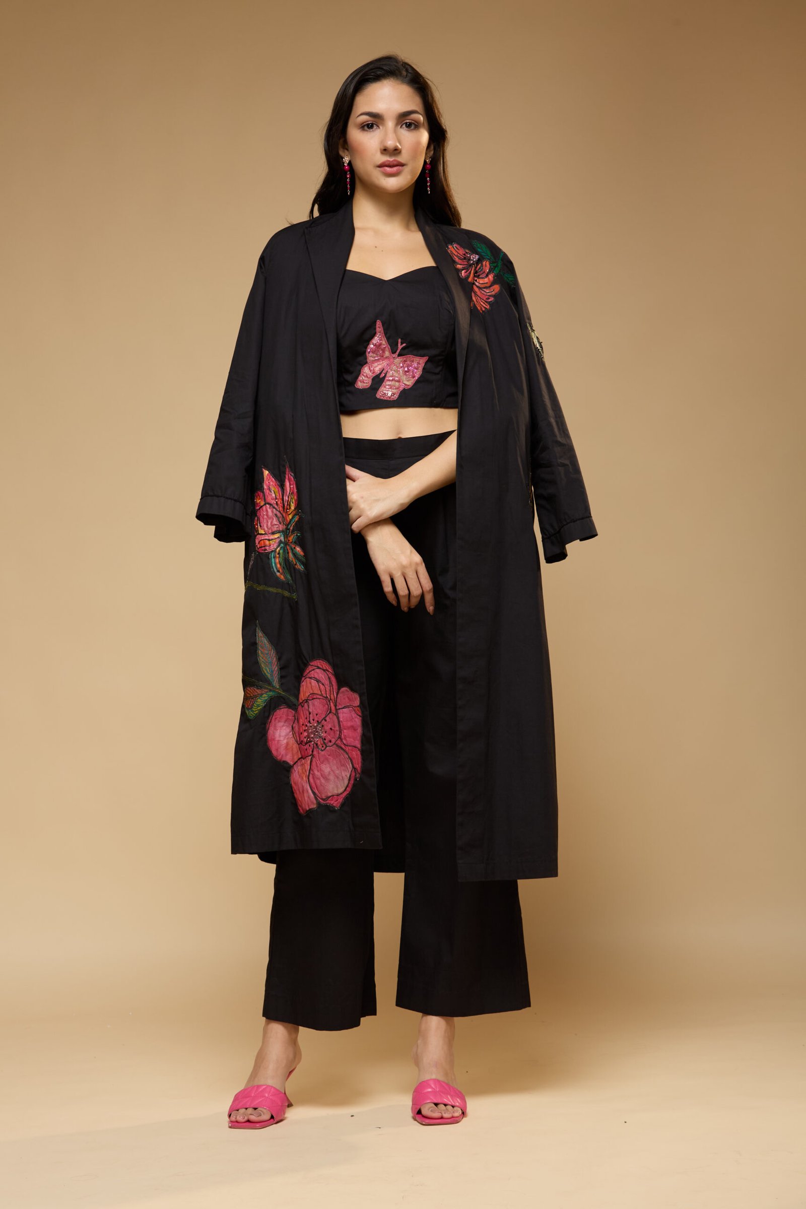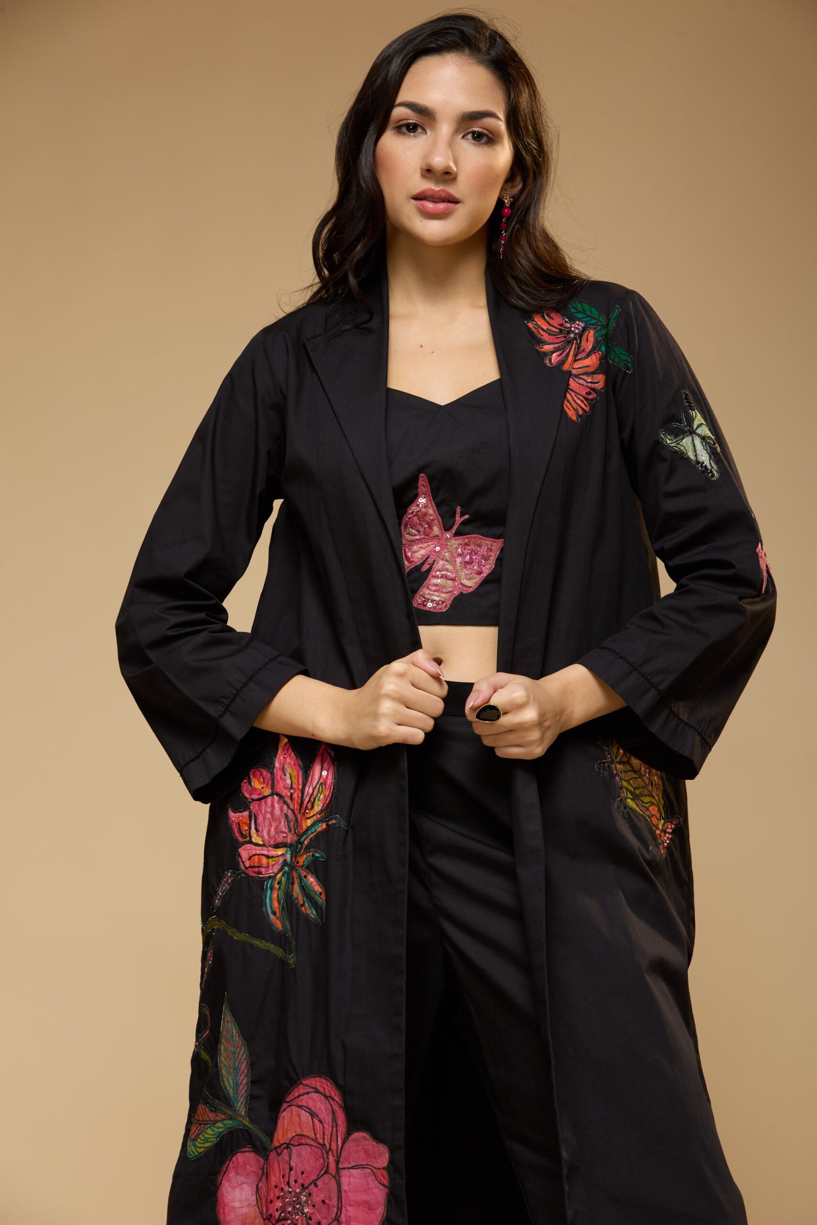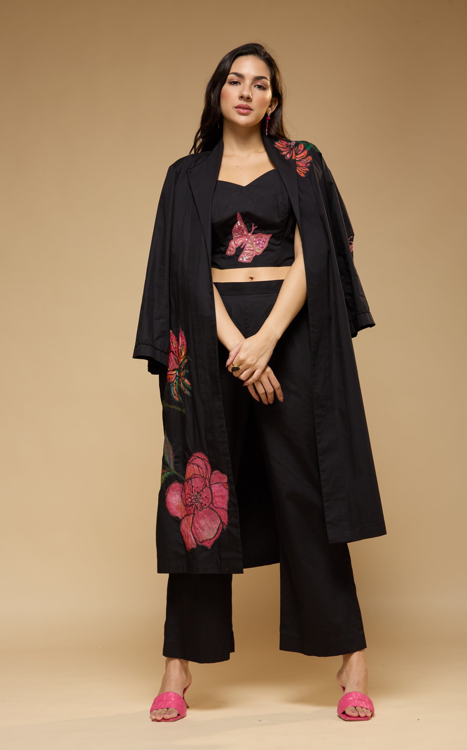 Fabric: 100% cotton poplin Style: Longline open-front overlay with lapel collar, Sculptured bustier and pant Embellishment: Hand-painted motifs from wearable art collection by Bina Aziz Grace meets artistry in this black midnight garden poplin overlay, adorned with delicate hand-painted motifs by acclaimed artist Bina Aziz. This relaxed, open-front silhouette features full sleeves and a flowy mid-length cut, perfect for layering. Ethereal butterflies and floral accents are gently painted across the fabric, lending an elegant, whimsical touch. Crafted in breathable poplin cotton, the piece is both lightweight and luxurious—ideal for elevated daywear or artistic evening styling.