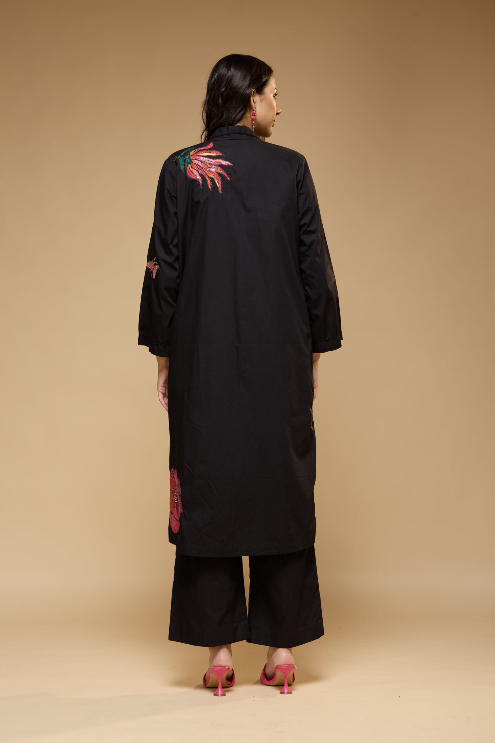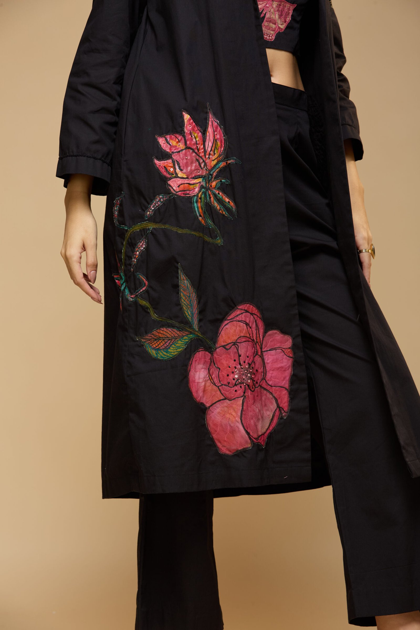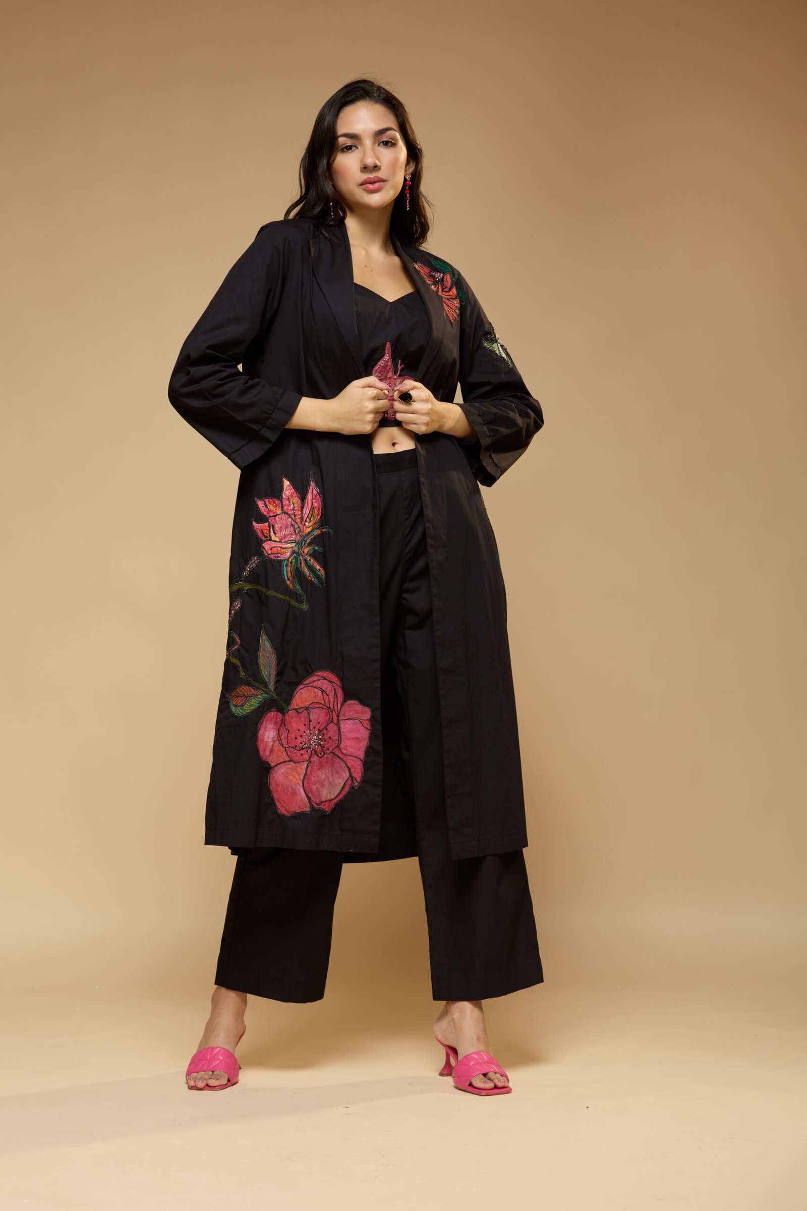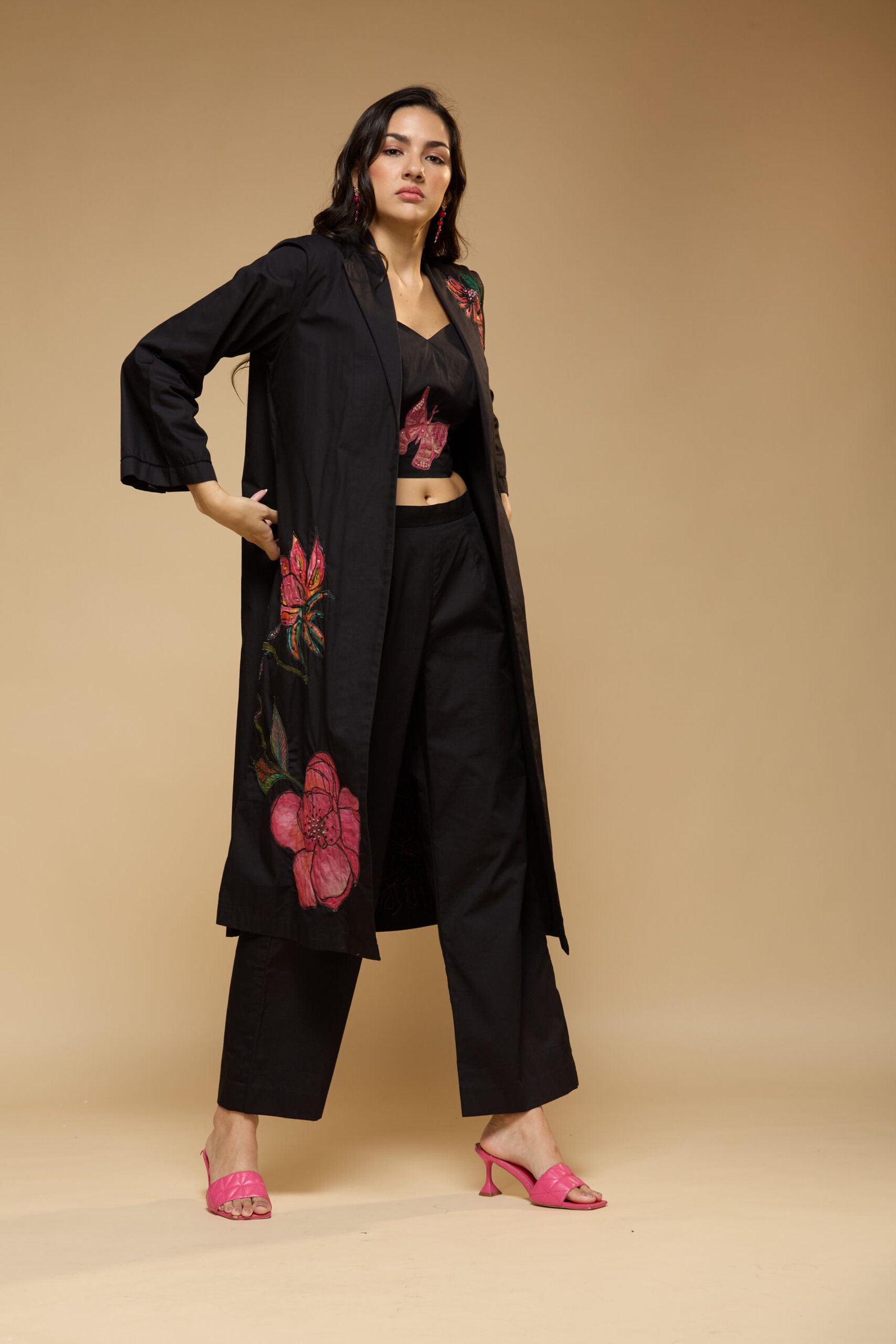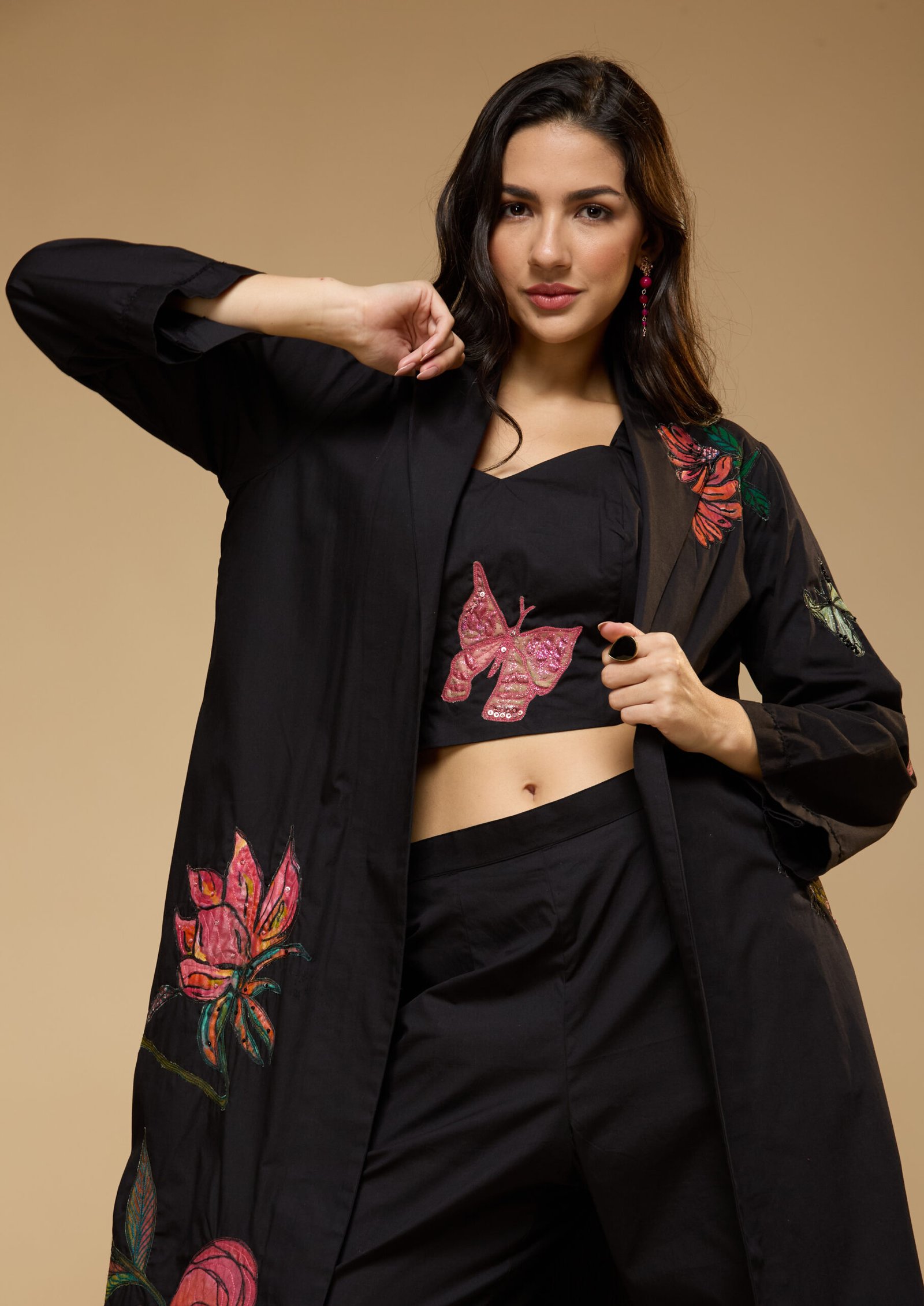 Fabric: 100% cotton poplin Style: Longline open-front overlay with lapel collar, Sculptured bustier and pant Embellishment: Hand-painted motifs from wearable art collection by Bina Aziz Grace meets artistry in this black midnight garden poplin overlay, adorned with delicate hand-painted motifs by acclaimed artist Bina Aziz. This relaxed, open-front silhouette features full sleeves and a flowy mid-length cut, perfect for layering. Ethereal butterflies and floral accents are gently painted across the fabric, lending an elegant, whimsical touch. Crafted in breathable poplin cotton, the piece is both lightweight and luxurious—ideal for elevated daywear or artistic evening styling.