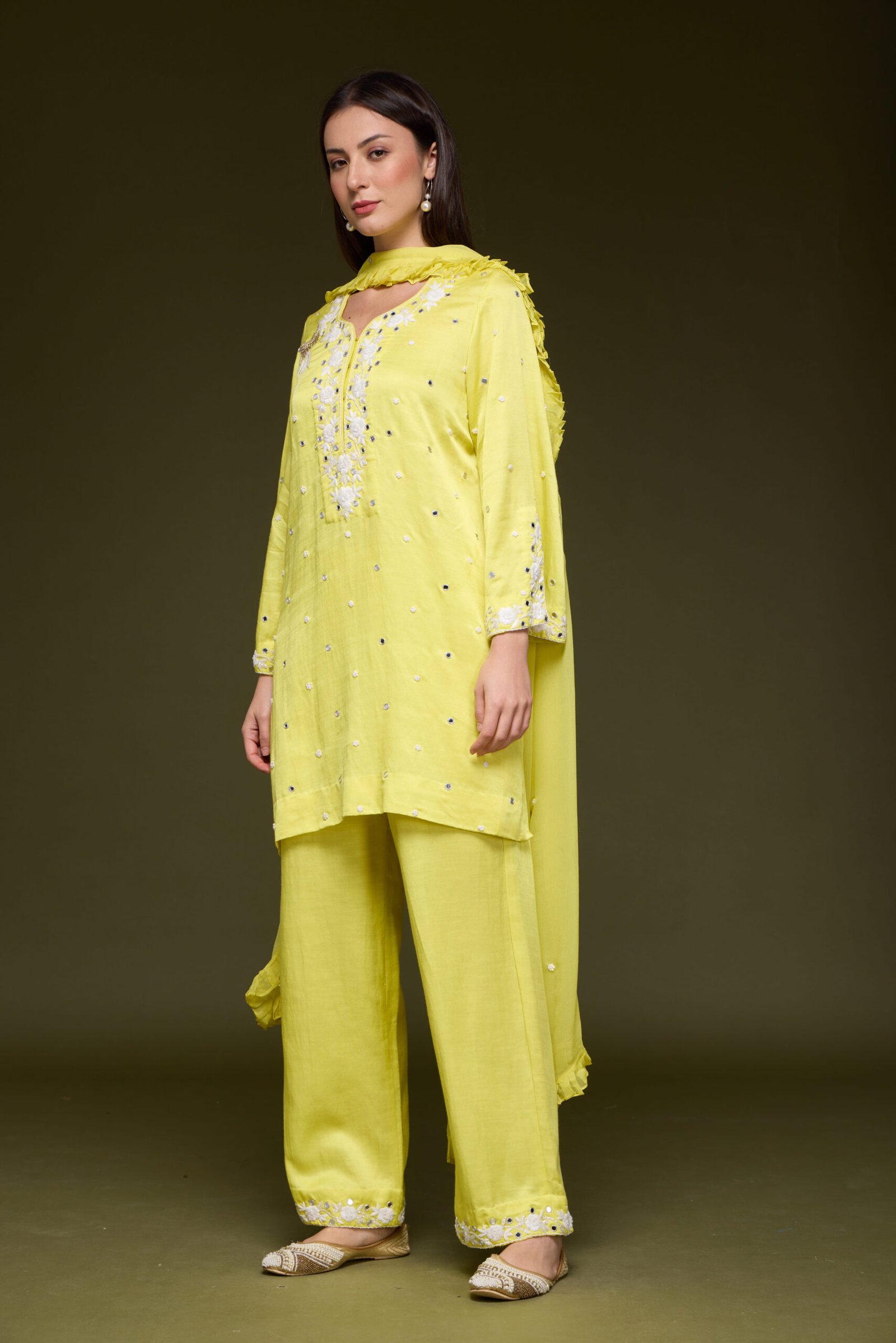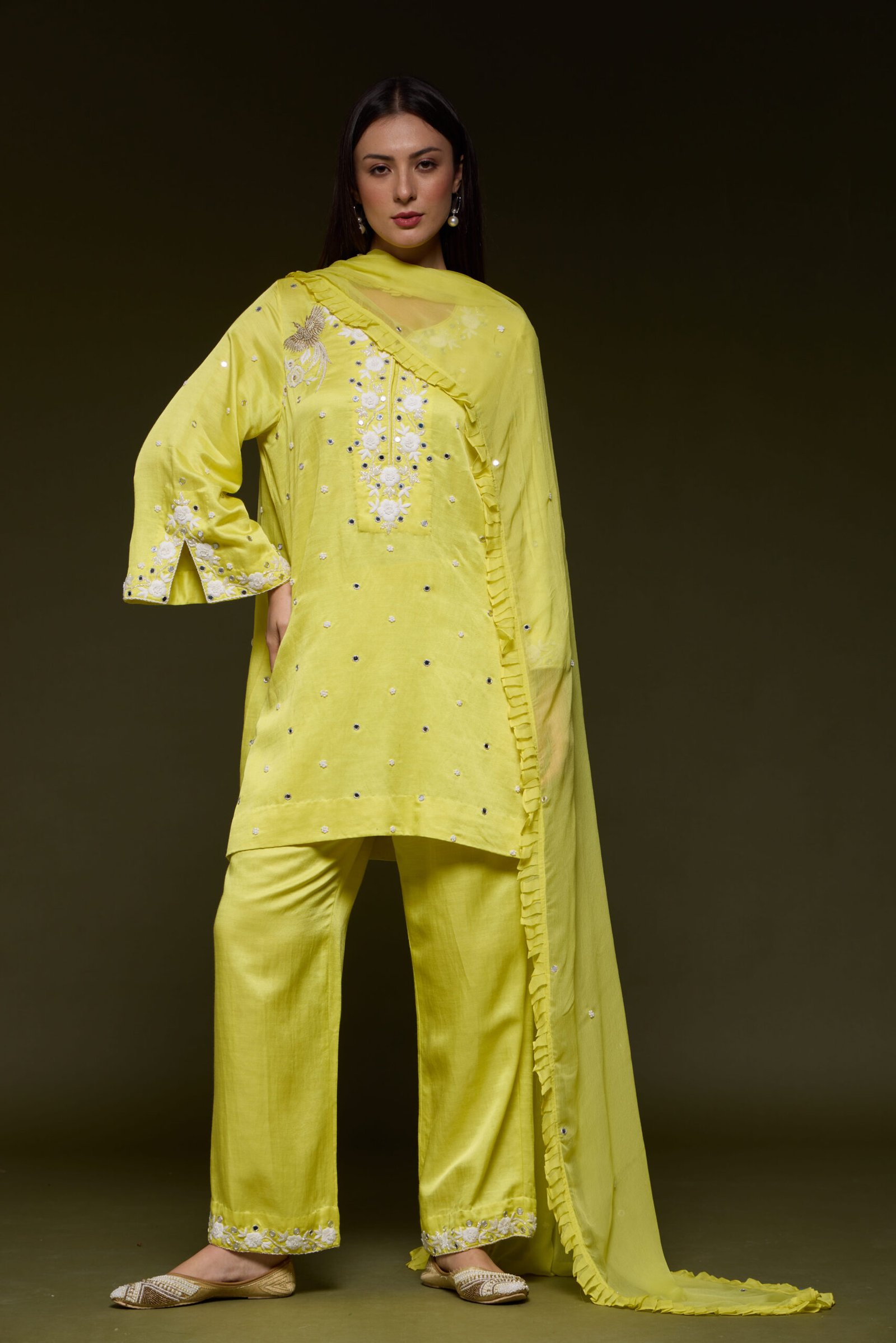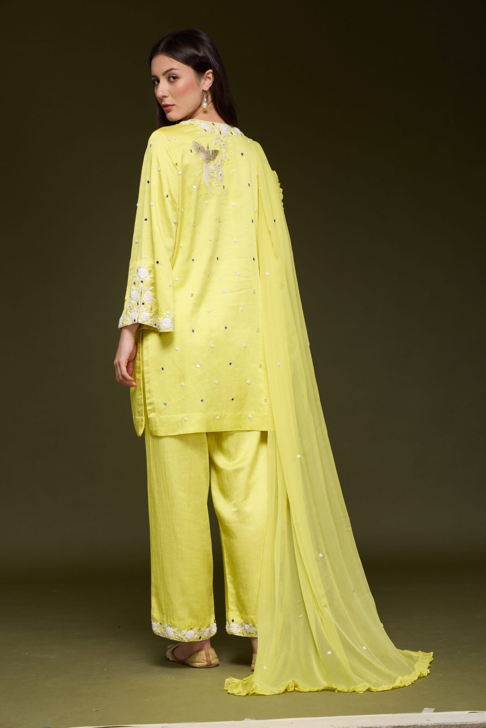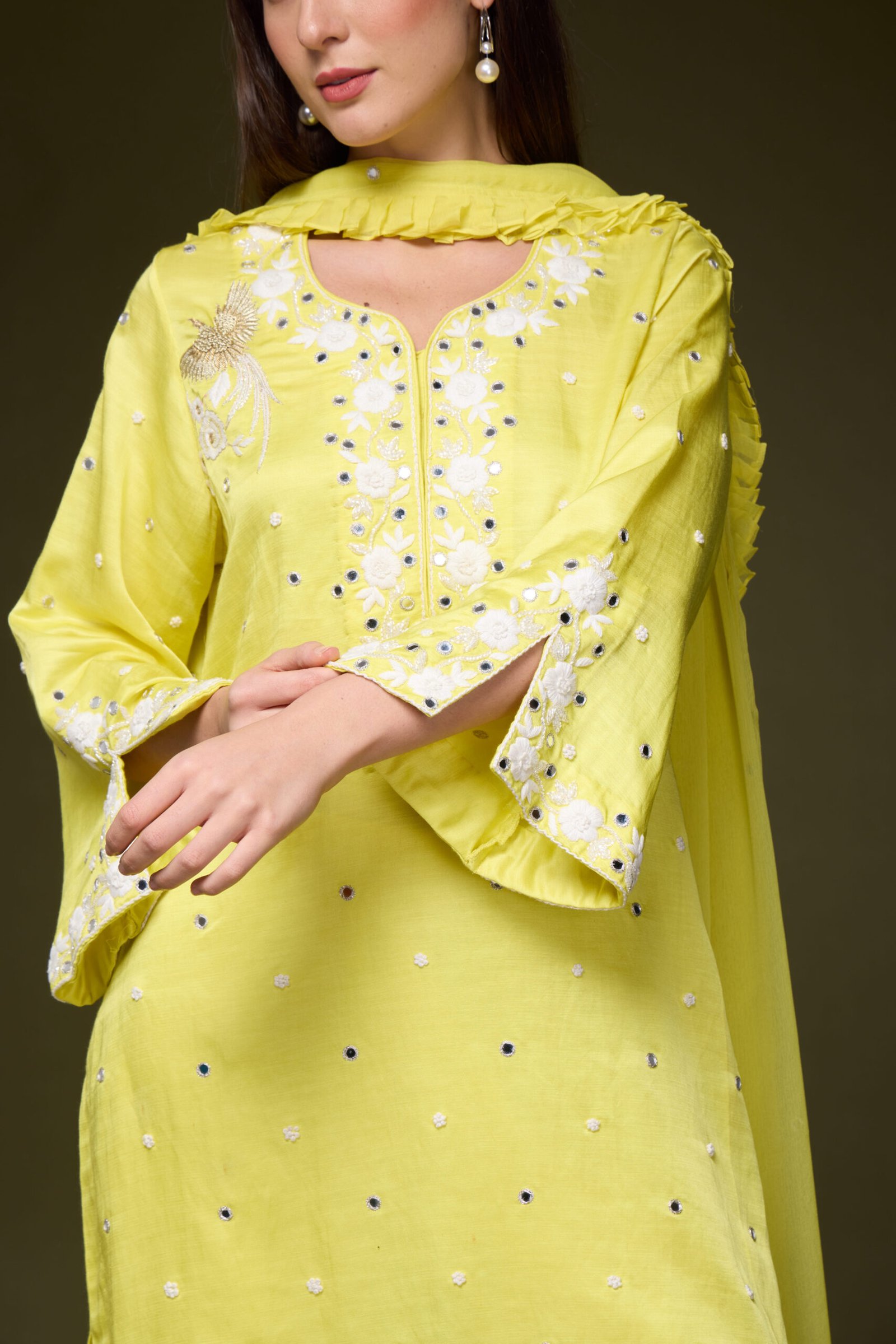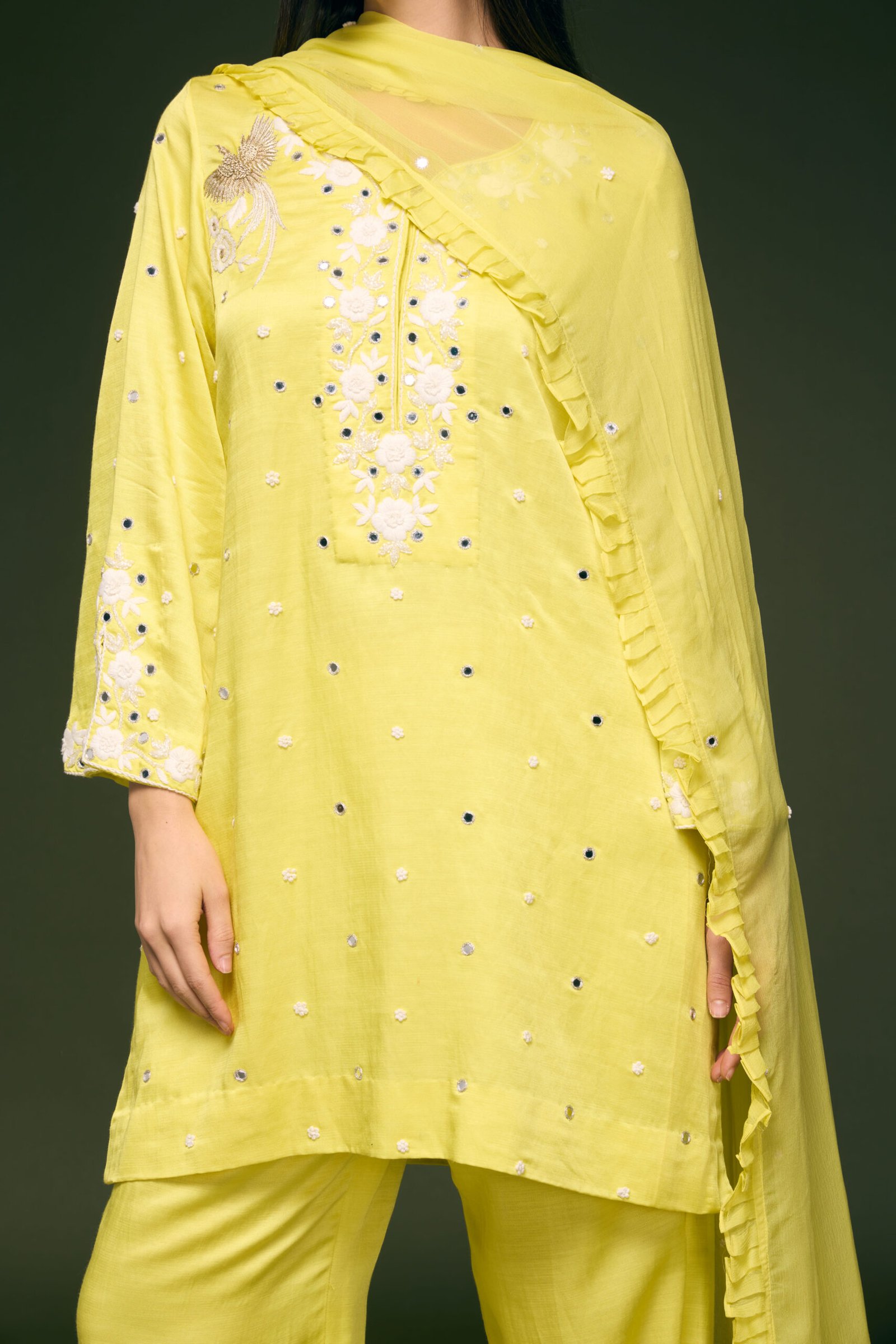 Lemon Yellow Linen Satin Fabric White Thread Zardozi And Mirror With Bird Embellished Top , Embroedry Pant ,Frill Dupatta.